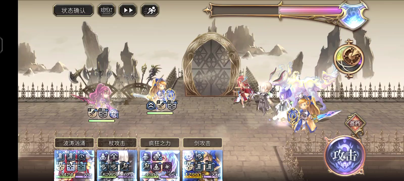 第一支队伍,日常清道中和点数副本通用 一般as燕一个普攻就能秒,偶尔遇到有耐性的,as皮鞭先制先挂个破碎,或者ac希儿开个打阵第二支队伍,水队,茉莉没抽出来,歪了个ac风奶,暂时用着吧,多了个开场极水阵。(魔剑和魔兽妹是p化架子,hp最大斧x2,水斧,法外之人p,王城p)第三支队伍,暗队,暂时够用,听说以后会有个强力辅助?到时候把眼睛兽换下第四张截图,老头和军师用来逃课,仙华as狼缺觉醒,