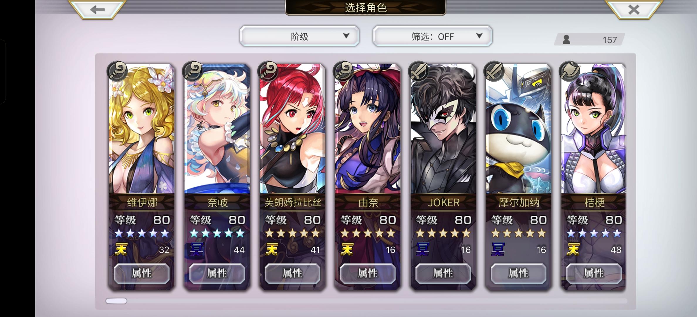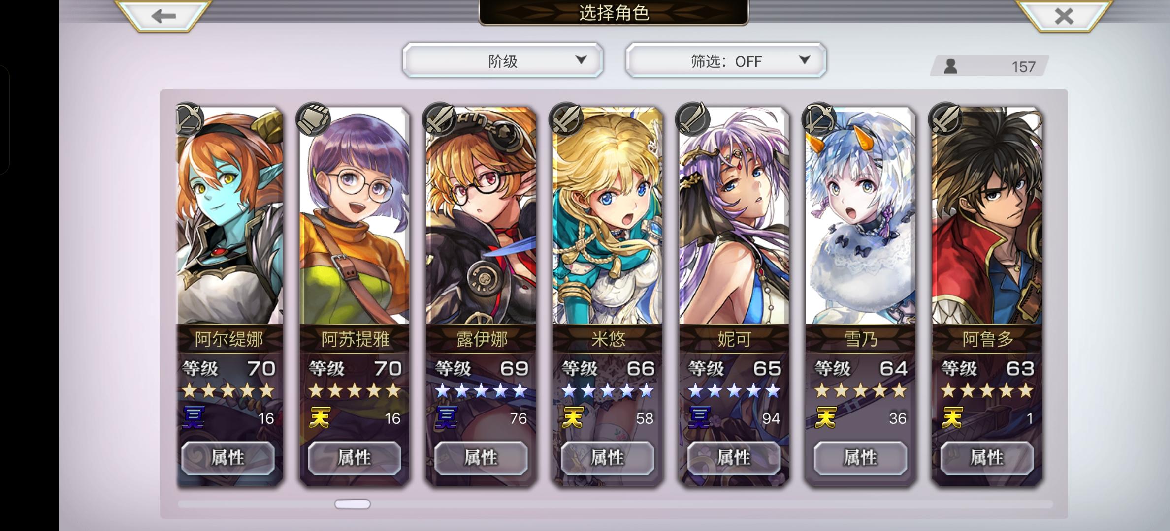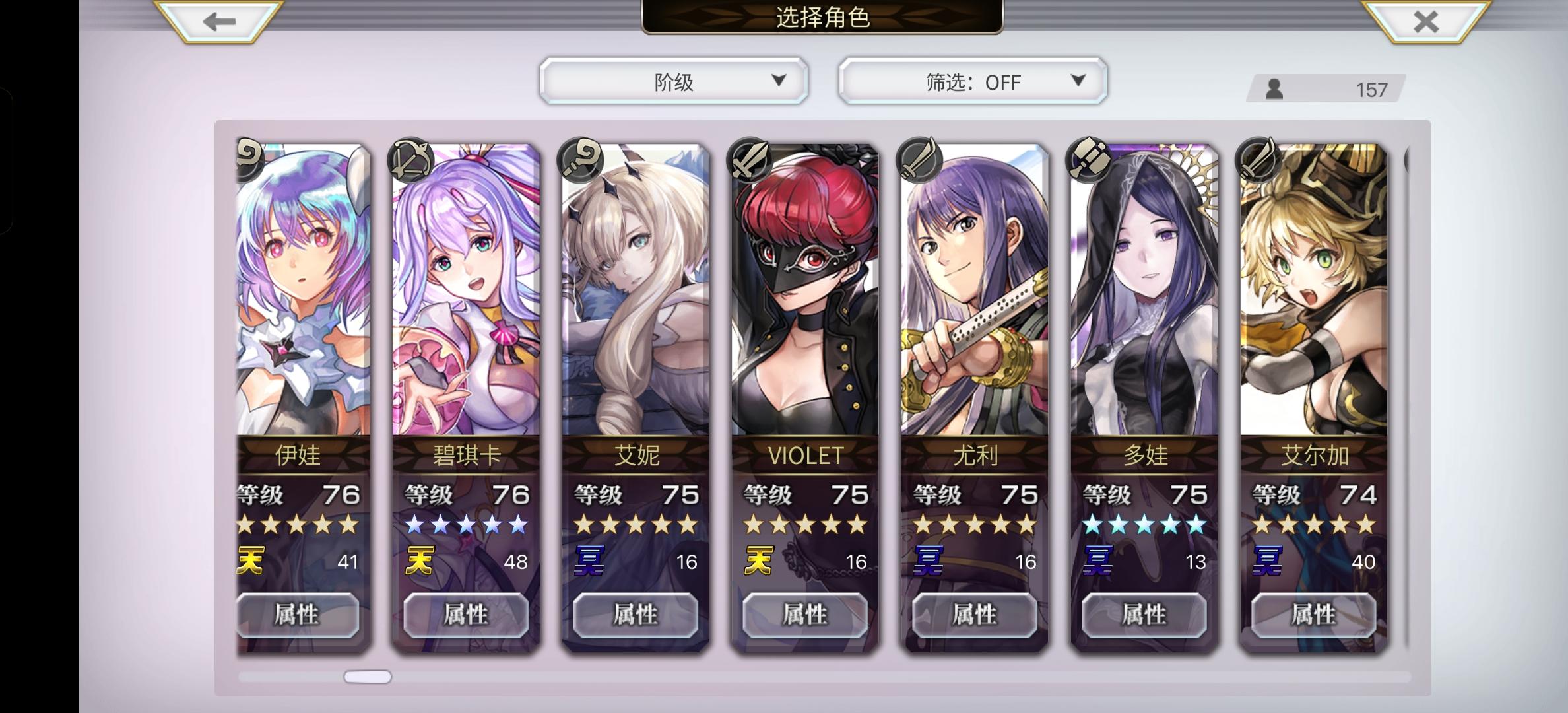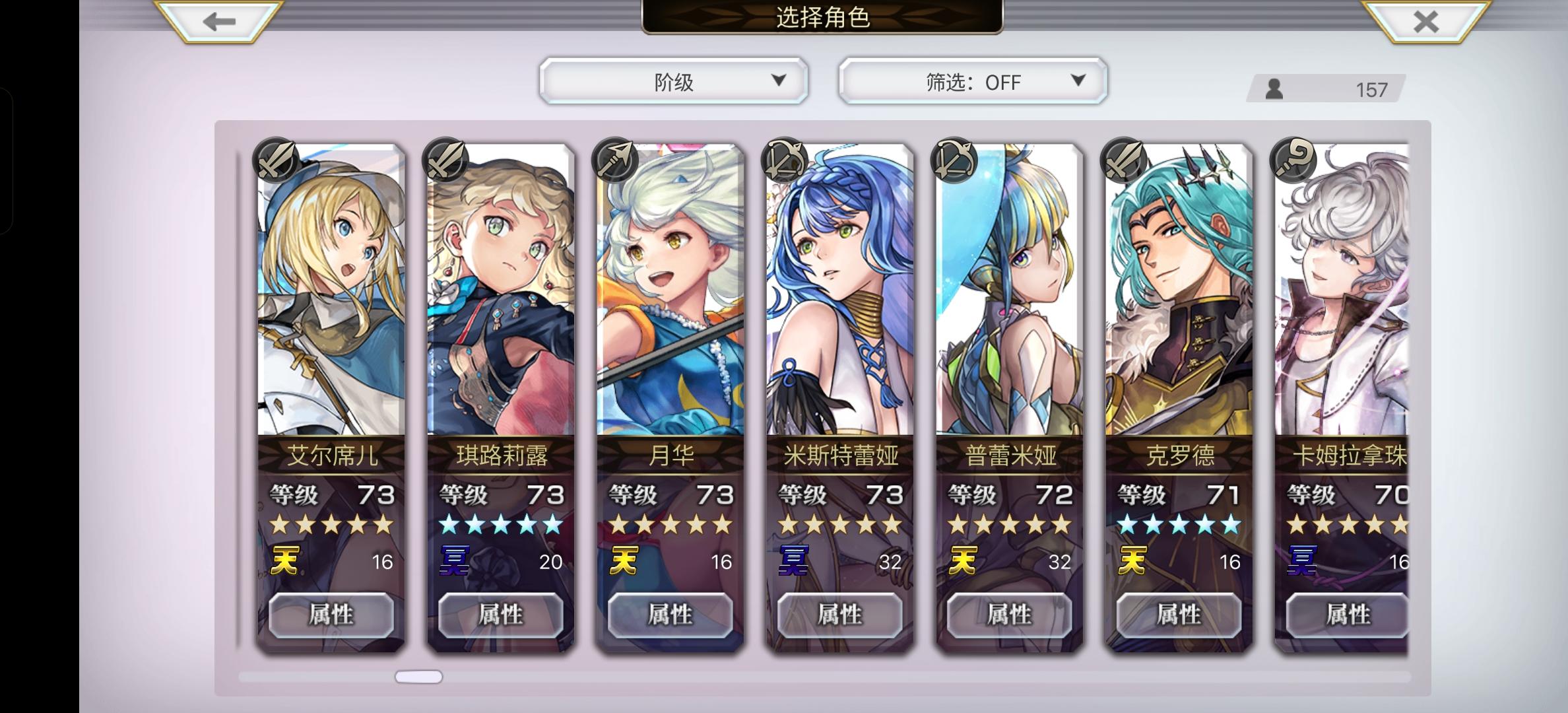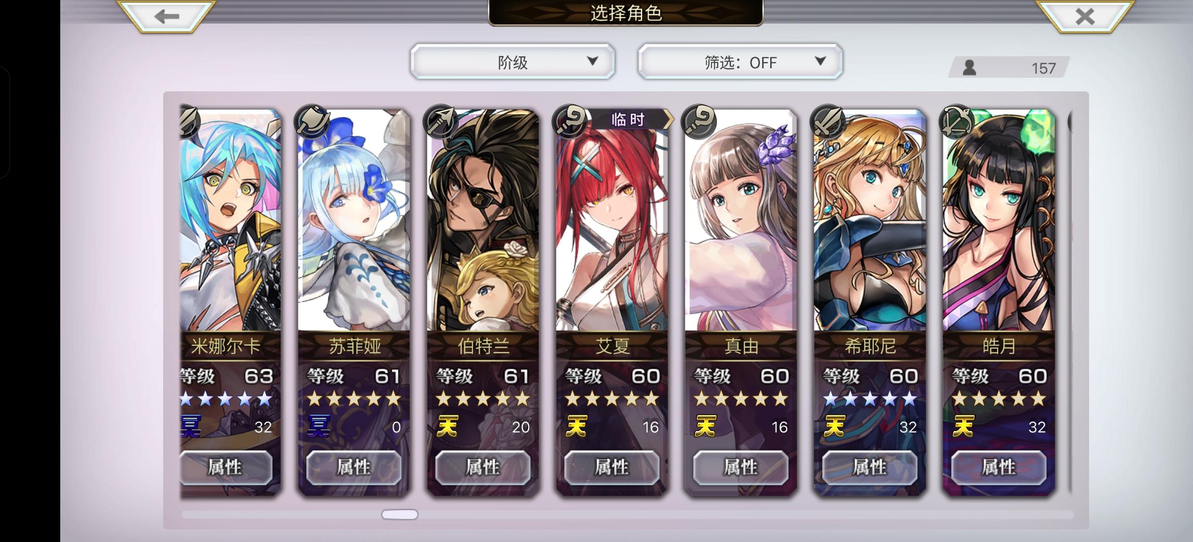 第一支队伍,日常清道中和点数副本通用 一般as燕一个普攻就能秒,偶尔遇到有耐性的,as皮鞭先制先挂个破碎,或者ac希儿开个打阵第二支队伍,水队,茉莉没抽出来,歪了个ac风奶,暂时用着吧,多了个开场极水阵。(魔剑和魔兽妹是p化架子,hp最大斧x2,水斧,法外之人p,王城p)第三支队伍,暗队,暂时够用,听说以后会有个强力辅助?到时候把眼睛兽换下第四张截图,老头和军师用来逃课,仙华as狼缺觉醒,