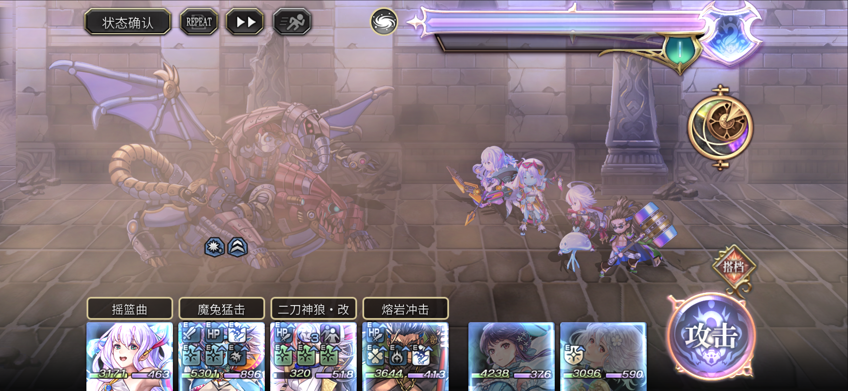 醒的早,正好试一下asac中二和会长之间的差距。先来看目前风队三人的Buff,ac燕,as狼,es时雨①风耐100%②属攻100%③武器伤100%④全队心机一体(as狼和es时雨自理)⑤as狼的全队70%力智速⑥es时雨的全队以下克上⑦除了时雨都有的弱点增伤ac燕提供的珠子这么来看,缺的Buff就是剩下的30%力智速,爆伤,砍物耐这三个比较常见的Buff1.看这两位角色的技能