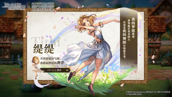 缇缇是《歧路旅人:大陆的霸者》中的主角之一,将通过协奏「末路之囚与启途八重奏」免费获得。⭐角色介绍:追求自由而舞蹈的舞者少女。不论在怎样的逆境中她都能燃起斗志与之对抗,拥有一颗强大的心。对年幼时遇到的某个舞者怀有憧憬因此立志要成为舞者。她厌恶那些对贵族言听计从的故乡居民,为了随心所欲地生活下去,她便离开城镇踏上了旅程。⭐个性:拳、启途旅人、雷⭐声优介绍:石上静香,1988年9月14日出生于