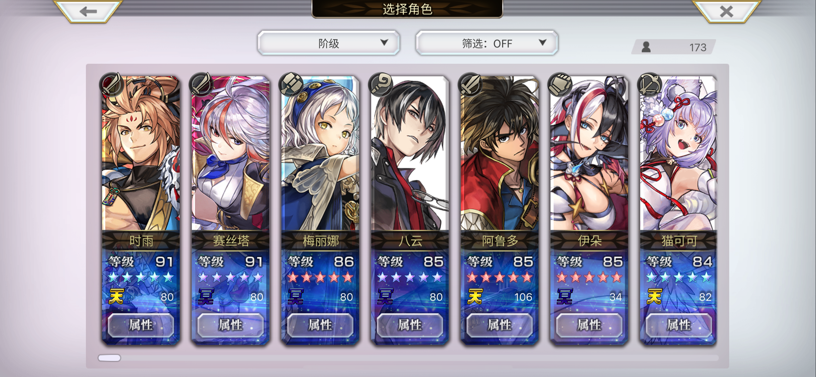 为了应对开局的异常状态混乱·封印·睡眠 给洁尔法妮装备降魔之剑重铸+50%异常耐性,10级月界手环+50%达到100% 给芙朗姆拉比丝装备绿灵之杖重铸+20%,煌耀戒指+60%,角色自带20%达到100% 给杜拿利斯装备净币+10%,10级月界戒指+50%,角色自带10%达到70% 凹点:如果点名龙妹就重开 2333 2妲1 231 131 231