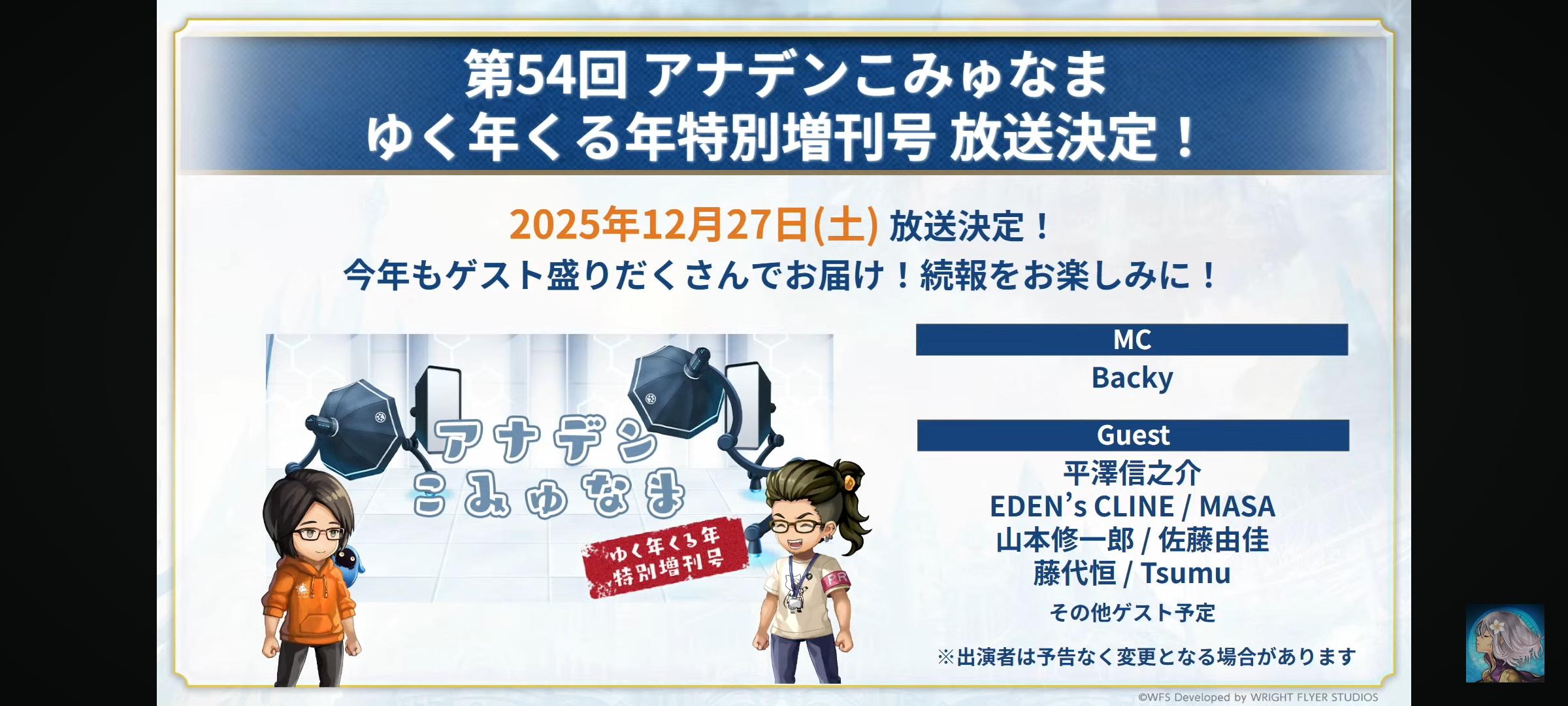 1)ACAS雾华(明芳)2)SA克劳德,ES希斯梅娜3)真专百讨下调(改成任意难度了),斗气提高掉落珠子概率提高4)卫星角色剪影(龙岛弓?千代?),下次直播12月27日5)cc联动结束倒计时延期+配布4位觉醒+ cc配布追加