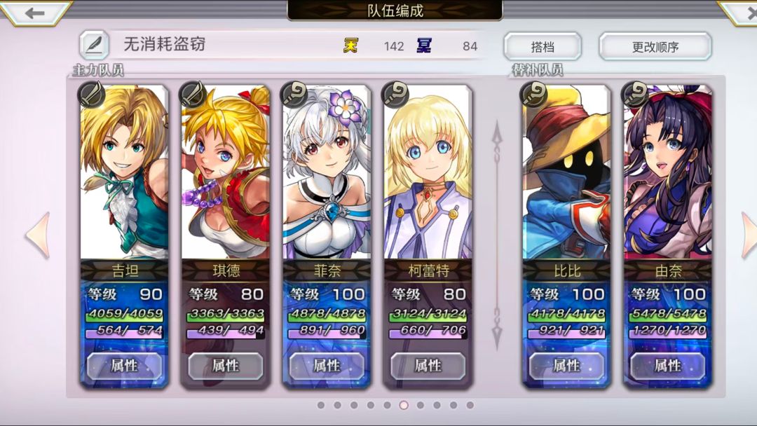 核心功能:一回合三次盗窃、无消耗刷怪 配队:吉坦、琪德、柯蕾特(均带先制攻击使用出盗窃技就行) 菲奈(觉醒后的上战展星海阵实现回血回蓝,无消耗拖地) 可更换角色:① 菲奈可以更换成觉醒神乐魅,同样可以实现开局回血回蓝并且舍身庇护,数值更高有防护刷图更稳定. ② 吉坦、琪德、柯蕾特可任意一角替换成帕特提欧偷金币,不过收益低,盗窃到黄金块比偷的金币好 ③如果刷的怪能实现第一回合内吉坦、琪德、柯蕾特