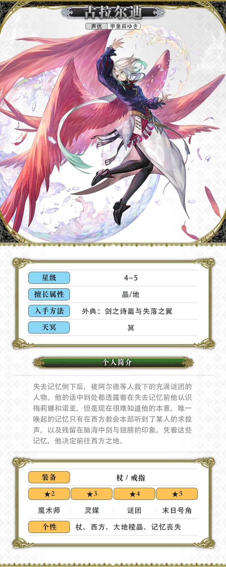 LV3 - 【这双翅膀 将成为宣告开辟之光】我方全体暴击率100%UP+魔法暴击率100%UP(1次行动)LV3 - 【在我等面前 万物皆如同幼儿!】(VC灵晶强化)我方全体暴击率100%UP+魔法暴击率100%UP(2次行动)固有能力【疯狂之力】普通攻击替换为疯狂之力,每场战斗仅可使用一次,获得【心眼】效果,持续3回合【心眼】技能威力提升,触发弱点攻击时伤害进一步增加【坚持】受