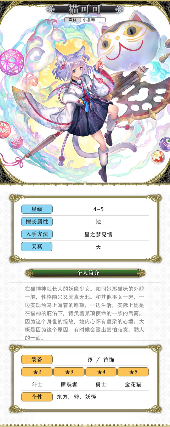 LV1 - 【一切都包在本猫可可身上喵♪】全体敌人力量10%DOWN+智力10%DOWN(1回合)LV2 - 【我会让你承认我的力量喵!】全体敌人力量15%DOWN+智力15%DOWN(1回合)LV3 - 【这个世界……就是我的归宿喵!】全体敌人力量20%DOWN+智力20%DOWN(1回合)LV3 - 【这个世界……就是我的归宿喵!】(VC强化灵晶)全体敌人力量20%DOWN+智力