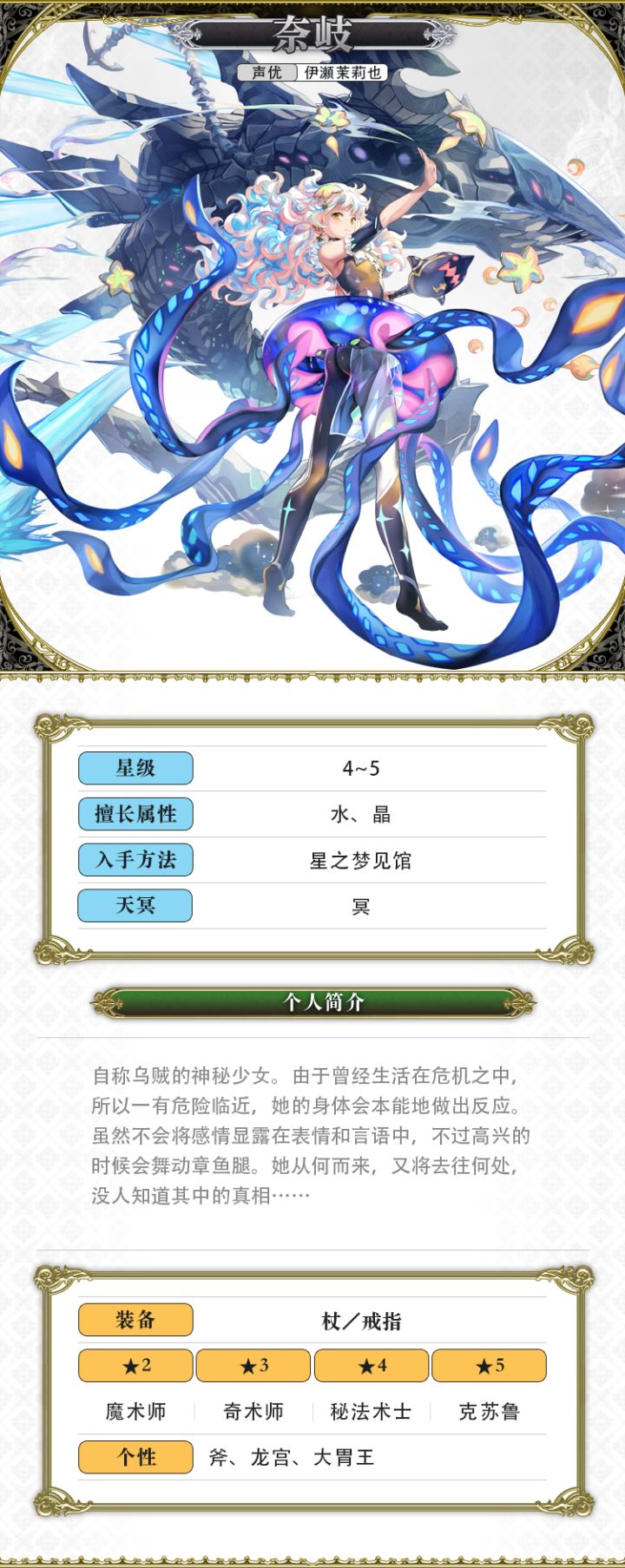 换阵咏唱LV1-【好的好~的!换~人!】给予敌方全体火属性耐性下降20%(1回合)LV2-【就算道歉也不能原谅哦~!】给予敌方全体火属性耐性下降25%(1回合)LV3-【给你看看更厉害的~!】给予敌方全体火属性耐性下降30%(1回合)固有技能【生命之光】魔法值:20我方全体物理耐性20%UP+附加治愈效果(小)(3回合)【生命之炎】魔法值:25我方全体物理耐性30%UP+附加