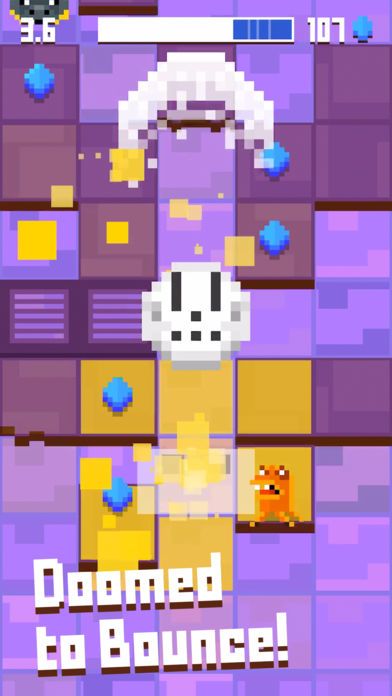 You are a round, pixelated skull, who endlessly jumps and pounces upon diamonds and monsters across toxic, lava-filled landscapes.