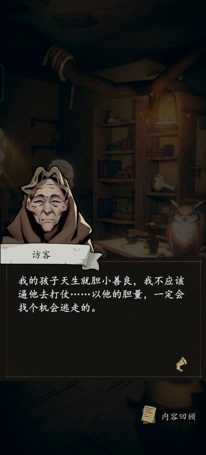 第1层开篇,执念之角猫头鹰和灯塔——执念之角不为人知的森林角落,有一座古老的灯塔。灯塔中住着一位名为“约翰”的老人和一只名为“伯爵”的猫头鹰。他们相依为命,过着孤独而平静的生活。每天老约翰会收集材料雕刻木雕,"伯爵“就安静地在旁边等候。一切的一切,再平凡不过了——寂静的灯塔、孤独的角落、忧伤的音乐,让人心情平静安宁。只是随着迷途的客人带着木雕寻来,一切的平静都戛然而止。执念之角——孩子