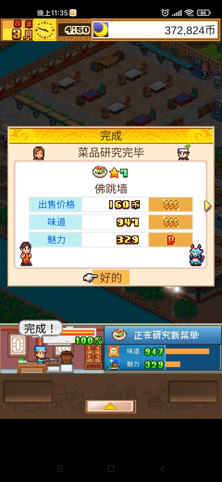员工一览 (全34普通+12生肖)顾客一览(全)佛跳墙菜品只缺麻辣小龙虾和三杯鸡,版本问题没拿到地区全一位最佳员工猪真厉害,除了研究都能999,解锁全部职业器材拿到了所有装修风格和器材但有几个放不下通关金奖金色的小龙军哈哈哈