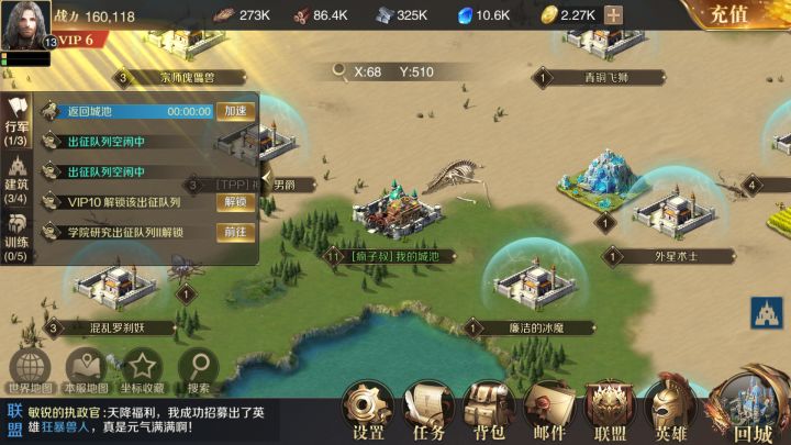 战端开启,万人同屏竞技所有联盟玩家同屏竞技。带领你的统帅铁骑,击败来自各个联盟的挑战者,开疆拓土,让全服的联盟都臣服在你脚下,让全世界的玩家都知道你的威名。