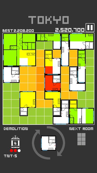間取りをエリアグリッドに配置し、縦横一列揃うと間取りに色がつき、間取り全てに色がつくと消えて家賃分の得点が得られます。
