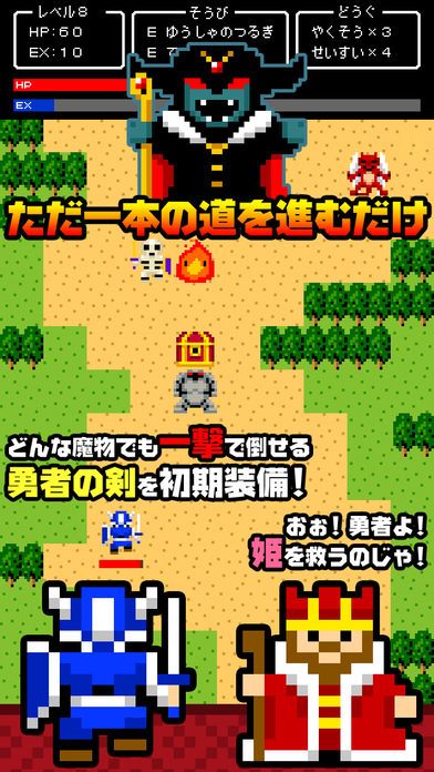 王様からどんな魔物でも一撃で倒せる"勇者の剣"を譲り受け、勇者は3つの目的を果たす為、目の前に続く一本の道をただひたすら進むのであった!魔王の討伐、姫の救出、そして・・・!隠された3つめの目的を解き明かすのは君だ!