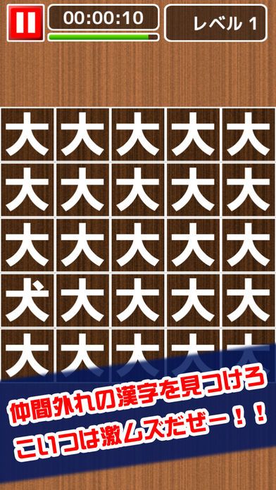 並んでいる漢字の中に1つだけ紛れている別の漢字を見つけ出してタップします。