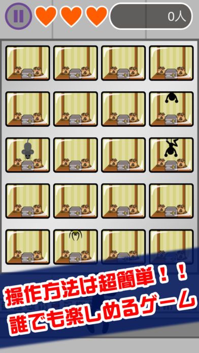 金庫を泥棒に捕られたり、ネズミやクモをタップするとハートが1つなくなります。