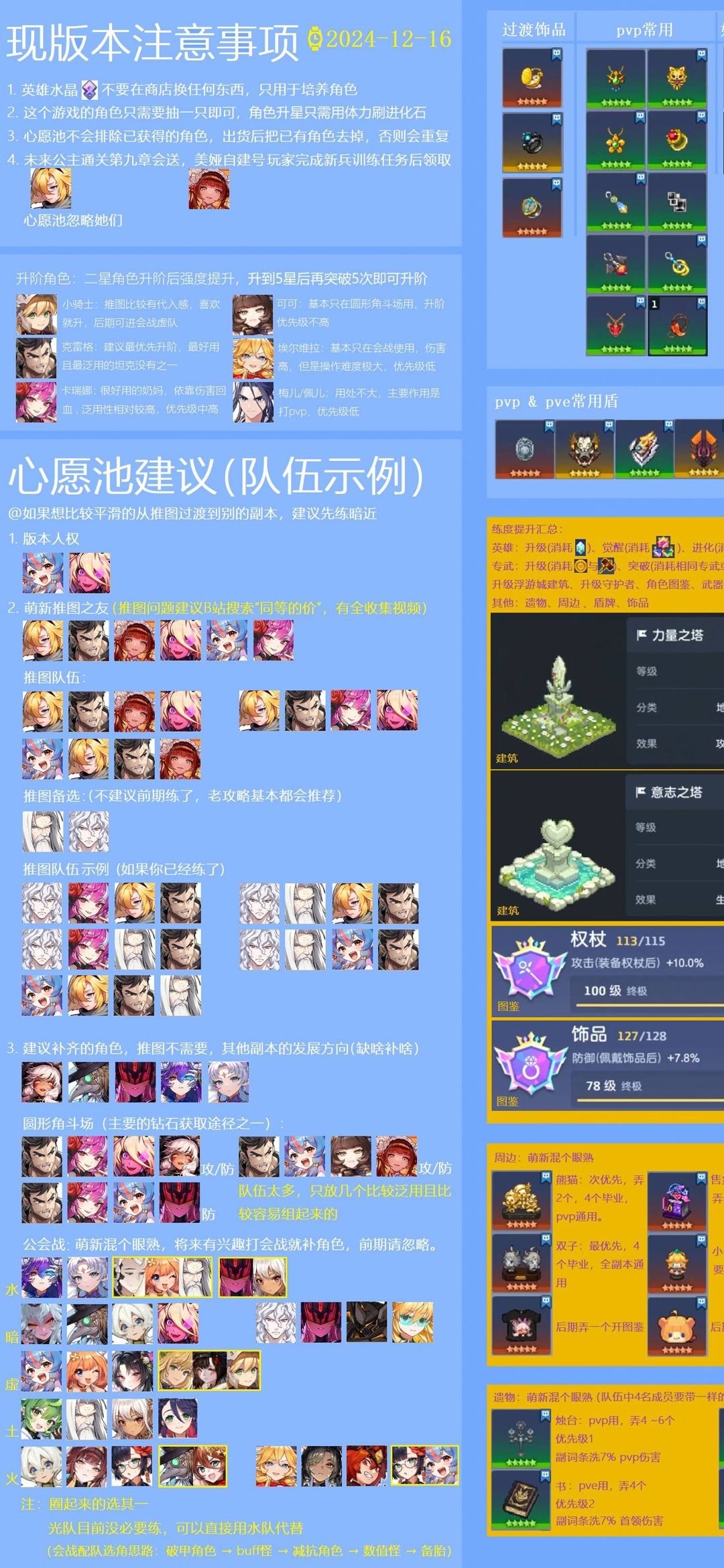 本贴只对自建号和初始号开局做的攻略。 自建号开局有新手任务及新兵训练,萌新专属签到活动(这个官方会提前会动态)第一张图是萌新守护者30天签到,下面是回归活动。 第三季改动使人物上限不受世界上限限制。萌新只要有一个95级五星暗刀可以通关大部分资源本, 焕发可以取消,等待你当天通关最高等级副本,进行扫荡。 饰品前期可以购买魔镜。 角色方面,自建号完成任务可以领到五星公主和火奶进化石,免费送火奶及自选专
