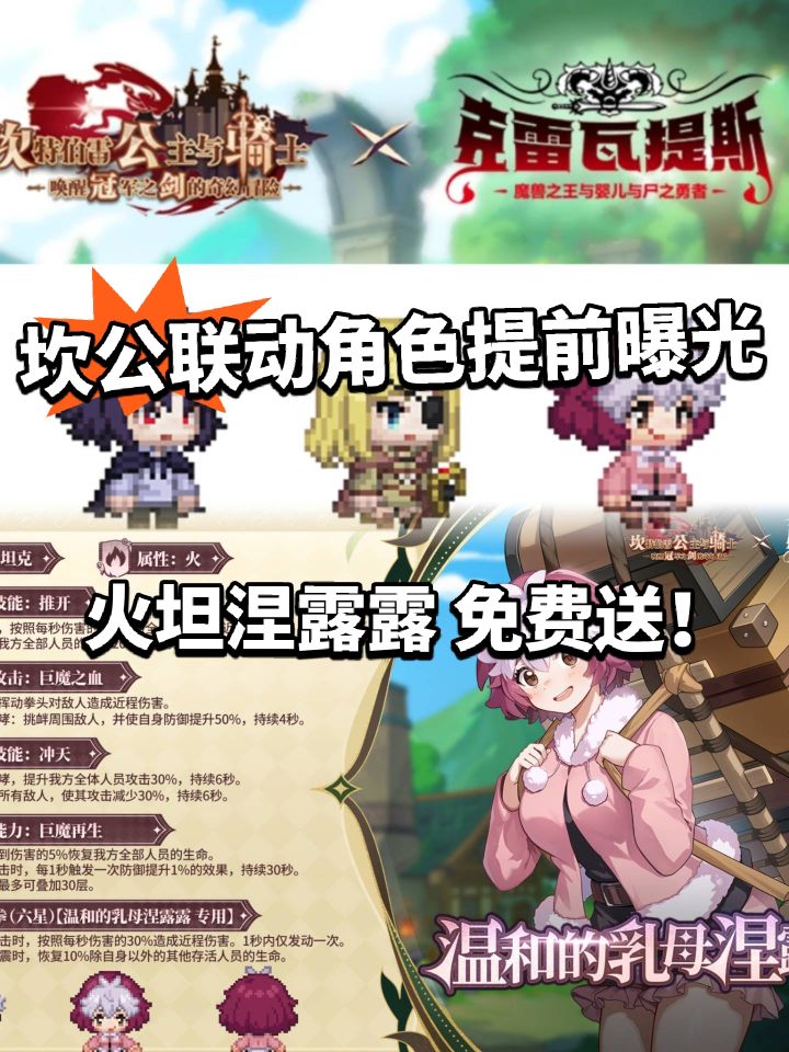 大的来了,家人们!近日坎公骑冠剑联动动画克雷瓦提斯的新角色正式曝光了,涅露露确定免费送,这事儿直接在社区瞬间引发热议。涅露露的人设特别戳人,生来就母性格外强,一直主动照顾着山贼掳来的婴儿,身世看着特别让人心疼。 2月12日游戏维护后,只要参与裂痕活动,就能直接领到3星限定传奇英雄涅露露,连她的专武都一起送。涅露露是火属性坦克,队长技能超实用,能按每秒伤害的300%打全体近程伤害,还能给全队