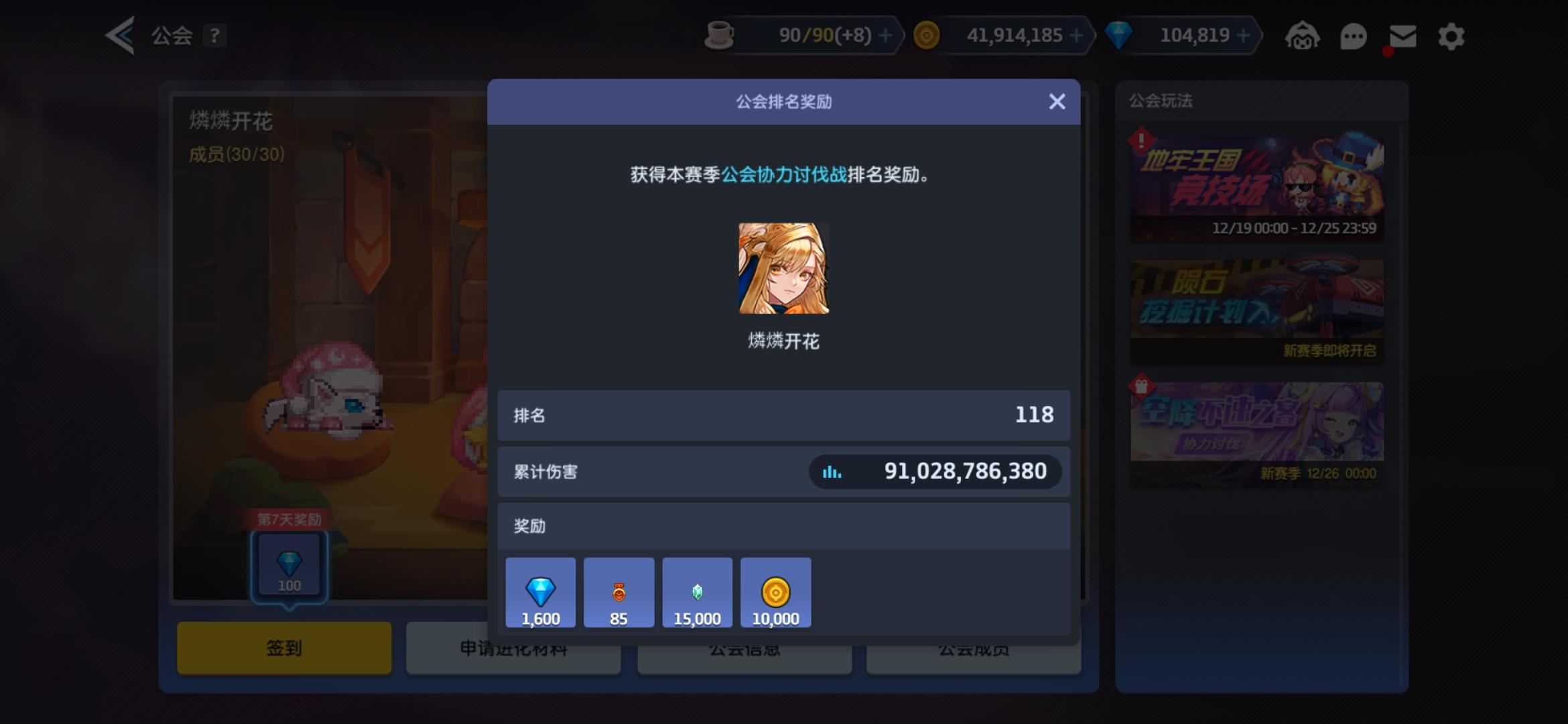 公会名燐燐开花,q群是527622896,本期公会战排名118,这期空余位置有1个,快来吧快来吧 要求的话,上期会战伤害8e以上,或者每天会战伤害平均算下来差不多即可,合适的话就来看看来看看吧