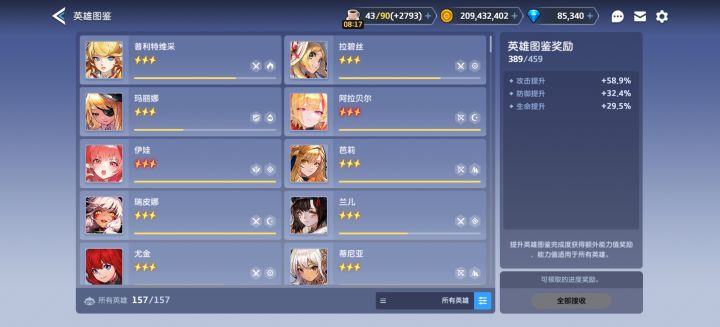 玩了655天了,装备羁绊全满,还在慢慢拉角色羁绊。图鉴的话已经是攻击高练,防御中练,生命中练,综合高练。