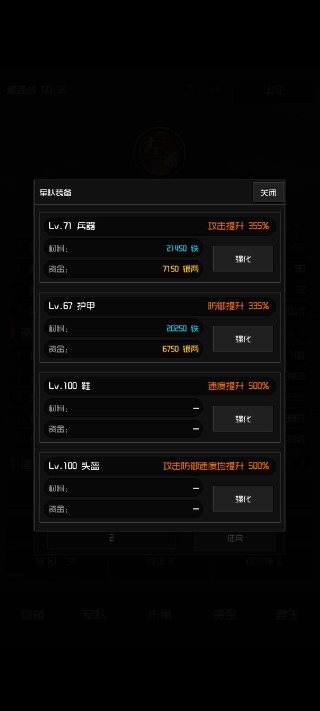 军队每种加成上限是100级。