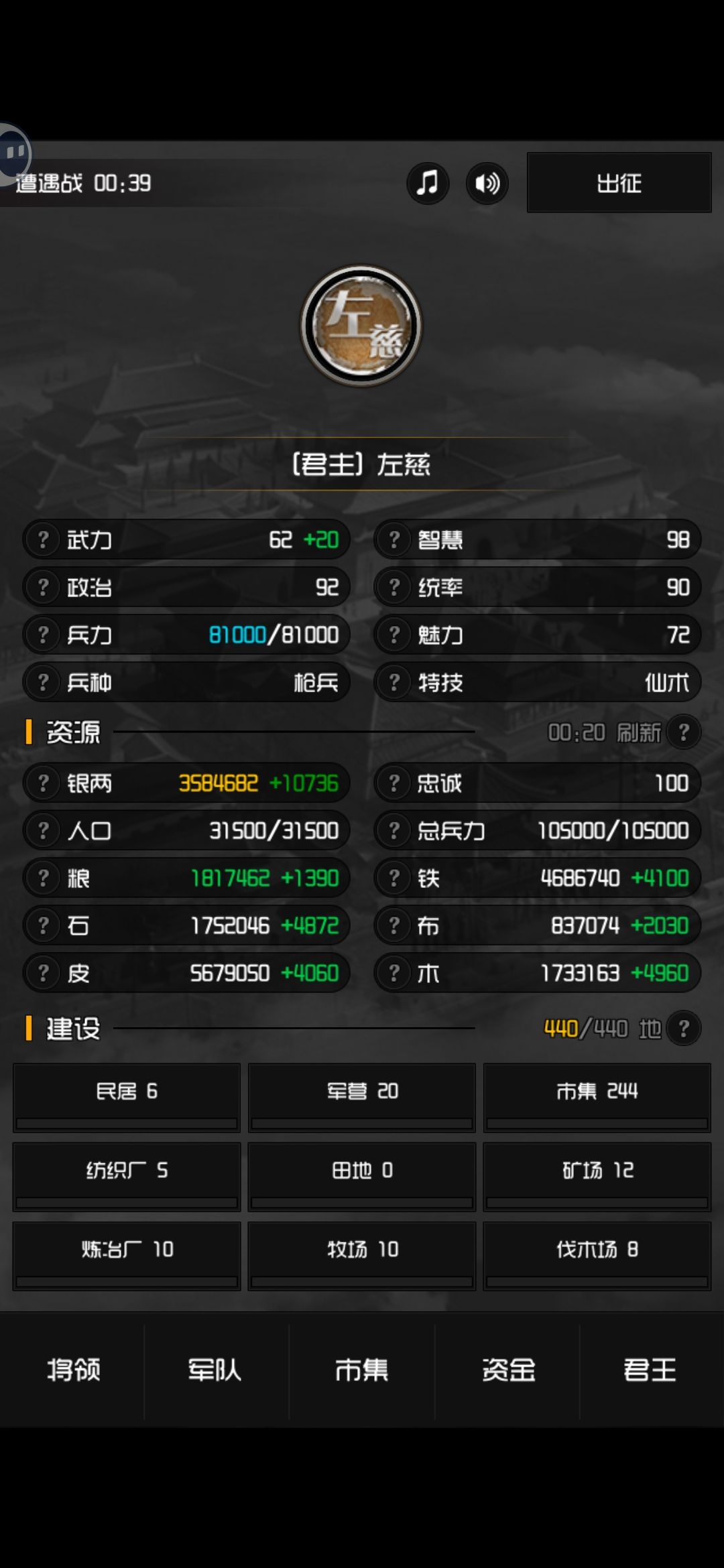 建两百个市场的时候市集可以买的都是七万上限,7要相当于其它每分钟产量2333,这没夺权之前基本不可能。这游戏数值太奇怪,就主建立市集才打的最快。