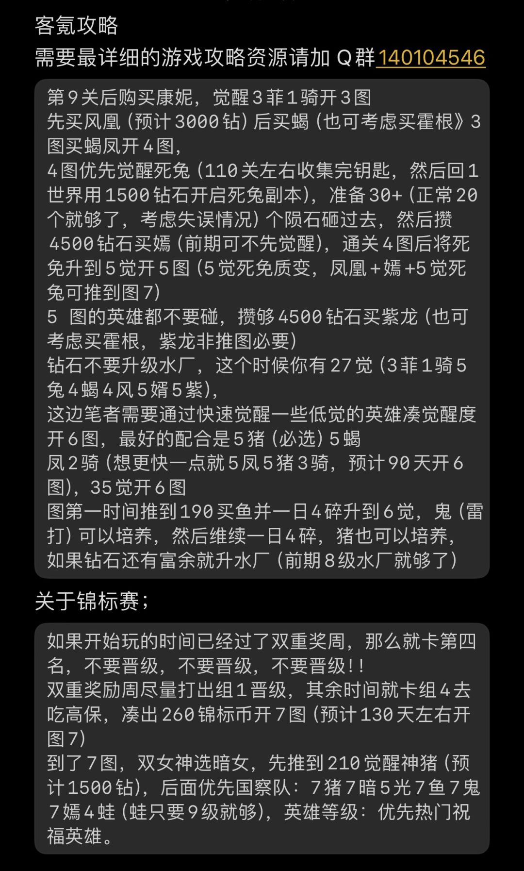 第9关后购买康妮,觉醒3菲1骑开 3图 3图买蝎凤开 4图,先买凤后买蝎 4图优先觉醒死免,准备20个陨石砸过去,加攻略q群140104546。看群文件死兔觉醒视频。然后攒7500钻石买嫣,通关4图后将死免升到5觉开5图5图的英雄都不要碰,攒够7500钻石买紫龙。 剩下的钻石不这个时候你有27觉(3菲1骑5兔4蝎4凤5嫣5紫),这边需要通过快速觉醒一些低觉的英雄凑觉醒度开6图,最好的配合是5猪(必