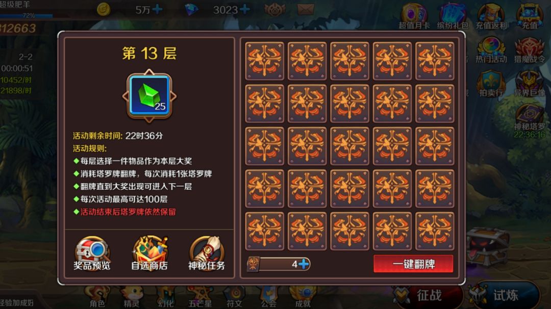 首先不要把钻石全抽完,钻石需要你留着做每日任务 其次,这个活动结束后塔罗牌可以保留,且爬的层数越高奖励越丰厚 那我们就需要一定的留卡意识,在缺金币的情况下你可以抽几发换金币来转转化宝石,其余情况尽量留卡 这个每日任务是消耗2000钻石,领取10张卡,那么塔罗牌就不需要你刻意的去买,你完全可以在做日常活动的时候花两千钻石出去攒卡,基本上每日快速战斗三次花三百钻石,买一次精灵神殿150钻石,抽宠物十连