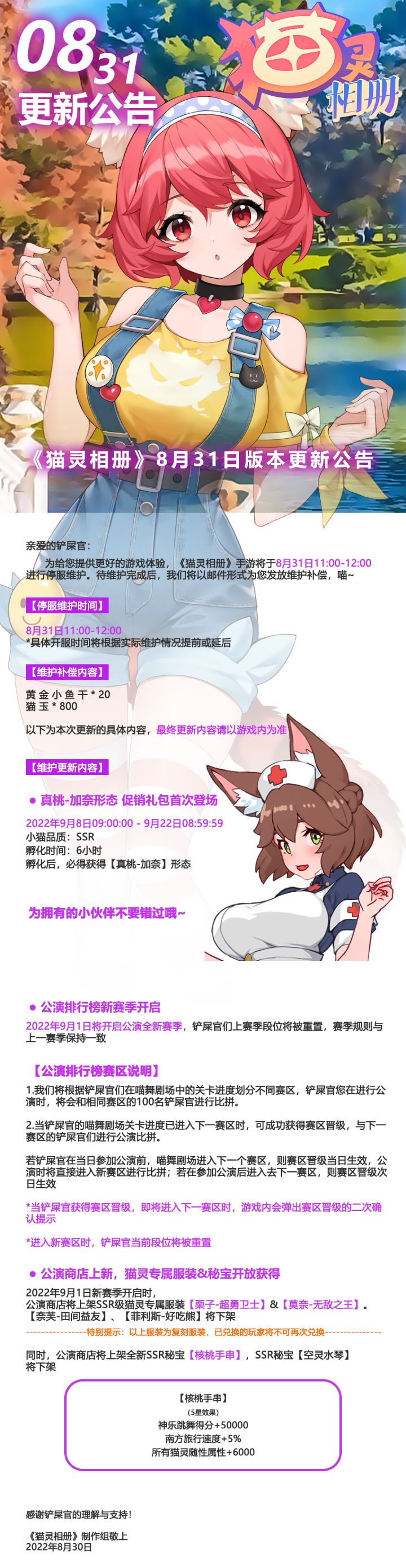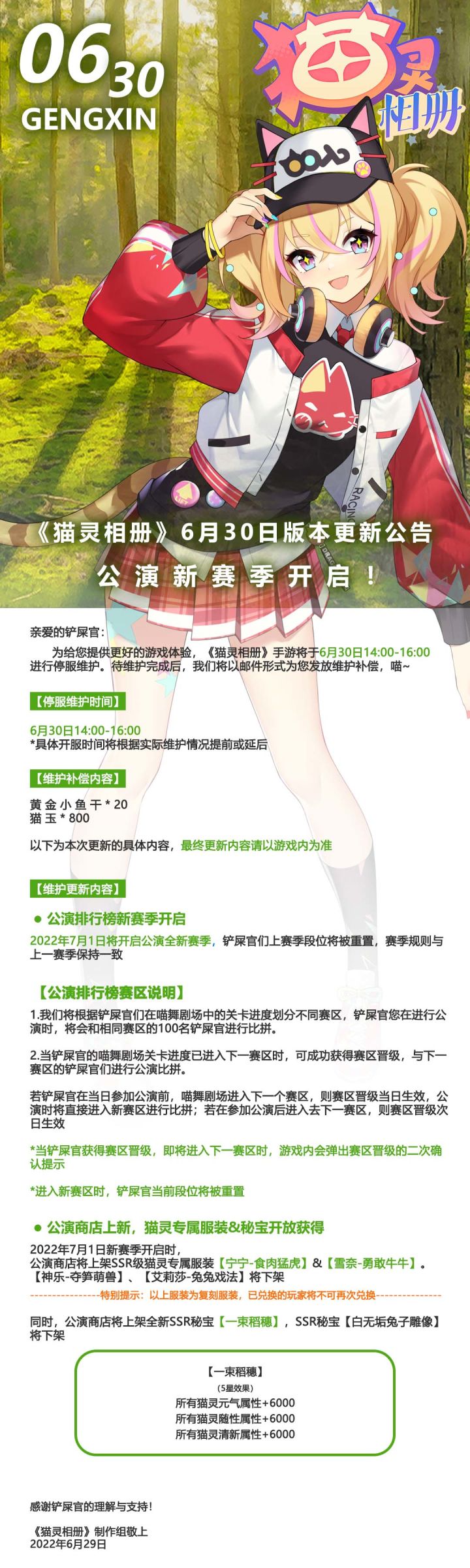 为给您提供更好的游戏体验,《猫灵相册》手游将于6月30日14:00-16:00进行停服维护。待维护完成后,我们将以邮件形式为您发放维护补偿喵!