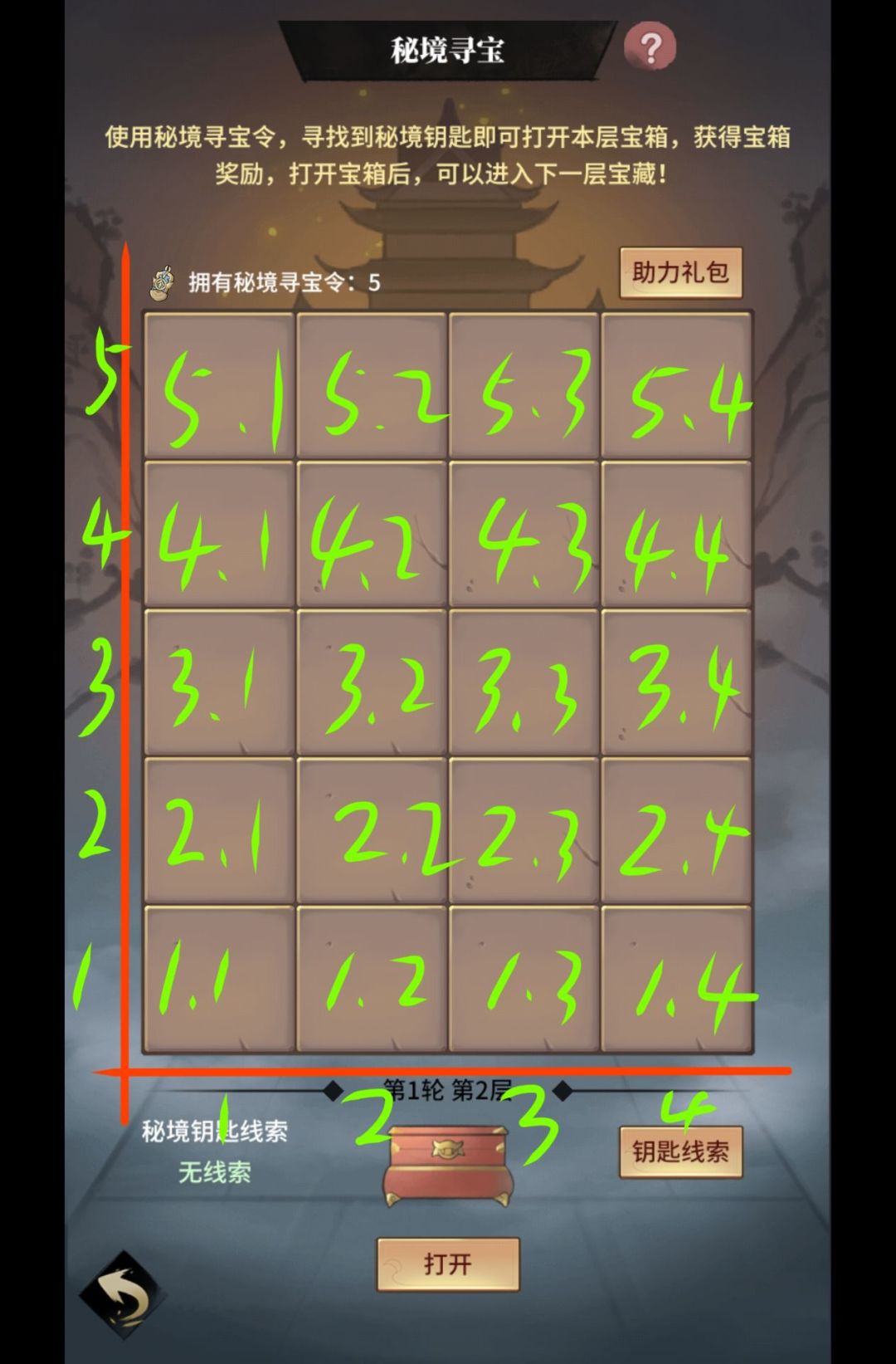 秘境寻宝线索:算式(加.减.乘.除.其一) 解读思路,笛卡尔右手坐标系:原点左下角 PS:线索来源,每层100金龟可以买一条线索,共50层,全买5000金龟,量力而行 活动格子总共20个。因为格子限制,算式前面的数最大竖5。 以下大致解法。列出所有可能成立的数学算式,算式前面两个数(竖,横)组合成坐标,🔑放在坐标范围其中。 坐标读取参考(竖,横) (竖?/线索加减乘除/横?)=线索数字。(竖其一/