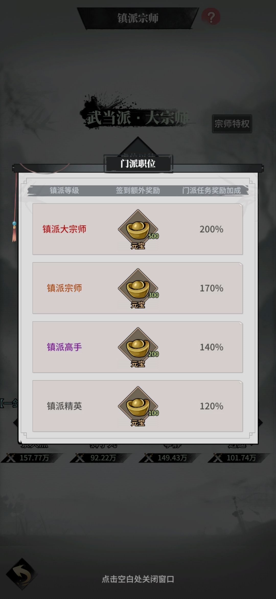 话接上回,上回咱们分享了一些初期的攻略,接下来咱们再详细说说还有那些要注意的事项,辰辰就是后知后觉,吃了这些闷亏,所以呢,今天就罗列下来,分享给大家! 1.镇派宗师,顾名思义,这是一个门派用来衡量实力的地方,有能者居之,同样的,这个地方也大有文章,小伙伴点进去查看宗师特权,可以看到,镇派大宗师签到有额外的500元宝奖励,并且门派任务奖励签到翻倍,所以呀,咱们每天如果有实力的话,可以先抢夺一下首席的