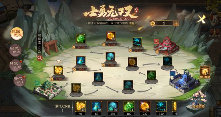 三军对垒勇者胜下个版本的主题活动来咯天下争锋,士勇无双两大换装即将上线还有签到好礼等你来拿快一起去看看吧士勇无双活动时间4月27日更新后~6月1日更新前活动详情本次活动主要分为了四个部分:三国无双、以武会友、择宝尽欢、齐心之礼墨梅盗帅梦*马超全新墨梅盗帅换装即将降临梦三大陆,在士勇无双活动开启后,大家可以在活动界面中购买墨梅盗帅礼包获取这款全新换装。梦*马超-墨梅盗帅与