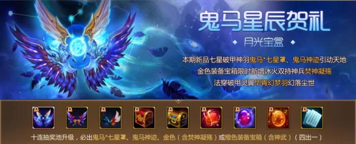 哈喽各位亲爱的小伙伴们,距离我们的暗夜封魔上线时间越来越短啦,随着这次暗夜封魔的上线,月光、月灵和月辉三大宝盒也即将迎来更新,你们不是天天问我大鬼马什么时候出吗,这就来了!不过梦梦依然要先提醒大家一句,随着第八期的结束,月辉宝盒中冥帝*风神翼和冥帝*堕神翼将在本次版本更新中下架(保留合成途径)。那么接下来,就和梦梦一起来看看第九期月光宝盒中都有什么吧!鬼马*七星罩、鬼马神迹、华胥幻梦羽加入