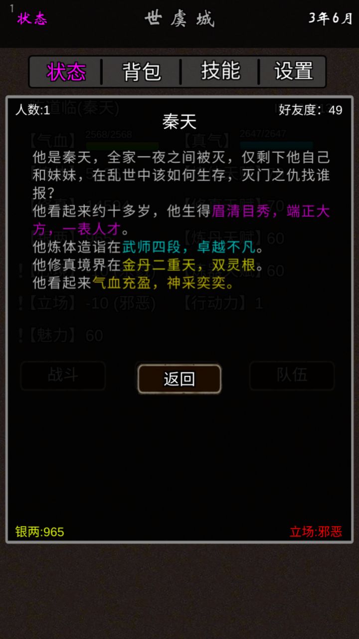 首先,个人认为,这个游戏最简单的方法就是全炼体过关,建议看攻略都过不了关的萌新去尝试一下。就是修炼只炼体,不修真。二,SL大法,游戏每天存档一次,如果那天你做错了啥,可以强退游戏重进,这个比较重要,因为每天体力只有三点,珍贵无比,SL大法可以帮忙省下很多体力(全炼体可以不SL过关)。三,第一关第一天出门打混混,想要娶老婆必须出门打混混,而娶老婆能获得10万铜币,不过老婆很菜,扛刀都嫌太脆。四