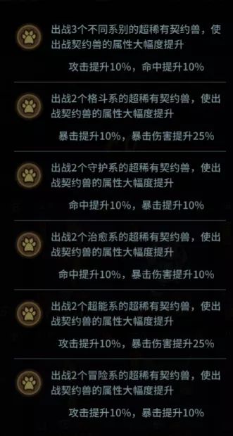 今天给大家带来羁绊的相关攻略~~有需要的小伙伴看这里~~ 羁绊是通过达成一定的条件来获取契约兽加成buff的功能。羁绊分为契约兽出战羁绊和大教堂羁绊。 【契约兽出战羁绊】 通过初心绿先知林地(图1)解锁契约兽出战羁绊。 出战羁绊效果有下图几种: 按照出战规则出战即可激活相应的效果, 字体变为金色表示已激活此项效果。 目前版本由于大家主要出战的契约兽都是露露+兔子+其它 或者是露露+荆棘女王+其它 所
