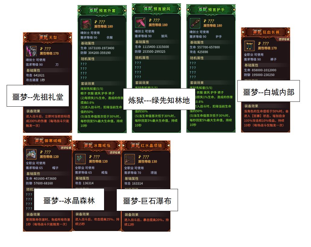 按噩梦炼狱副本解锁顺序 一渊噩梦 御寒绒帽(1s免死,冰晶森林掉落) 二渊噩梦 复苏帽(通用,血低回复,王者棋盘噩梦首领掉落,普通首领掉落) 练功服(适合魔导,使用技能8秒25%减伤,云巅悬崖噩梦掉落) 三渊噩梦 契约长裤(宠物流,人物罚站,山脊矿道噩梦掉落) 盾契披风 (通用,叠满40%减伤,山脊矿道噩梦掉落) 绝缘裤子(通用,释放技能提升元素抗,白城南门噩梦) 凤凰披风(通用,低血触发回血减伤