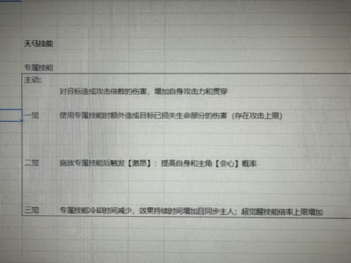 哈哈哈,大噶好这里是侦探五郎,这次五郎打听到了马上要推出一个全新的神话契约兽,据说很厉害,提灯者猜猜它是什么呢?在评论区一起发表下对新神话契约兽系别、属性、技能的猜测吧!还有机会赢取丰厚道具奖励哦天马爆料第二弹!哒哒哒哒!本来今天周末五郎在公司闲逛偷听策划好像在讨论什么技能强不强?在和策划“友好沟通”一番后本喵拿出私人定制的高端手机拍下了技能配置表(初版)关于烈焰天马技能