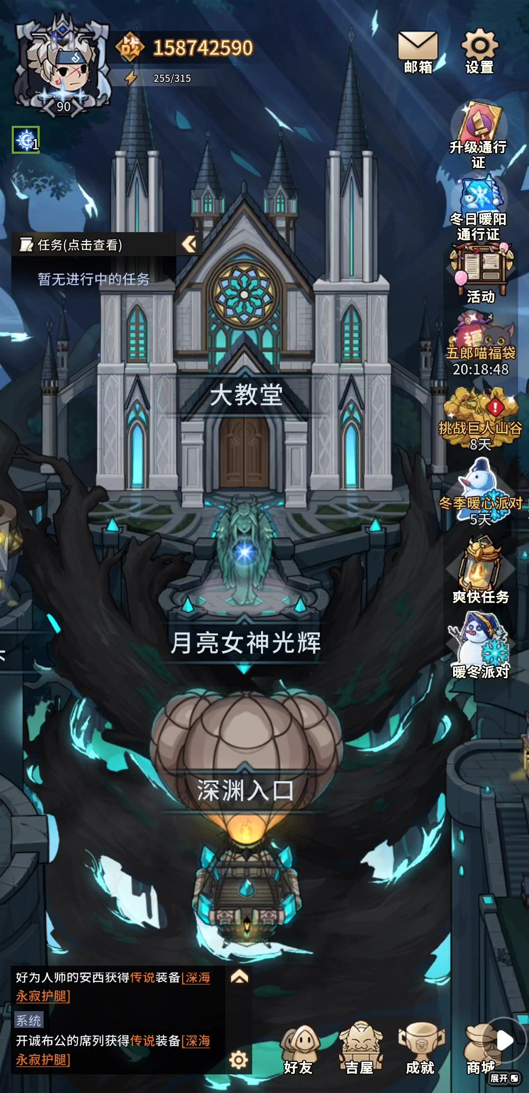 装备推荐:夜影头(卡戎)、练功服(第二渊云巅悬崖区域三boss)、崇高鞋、巨人护手和披风(巨人山谷活动兑换)、混沌戒指(第三渊白成内部区域三BOSS)、暮色项链(卡戎)。武器有神话带神话,没有就带深海。 宠物推荐:必带一世二觉鲸鱼,另外两个带自己最高战力宠物。