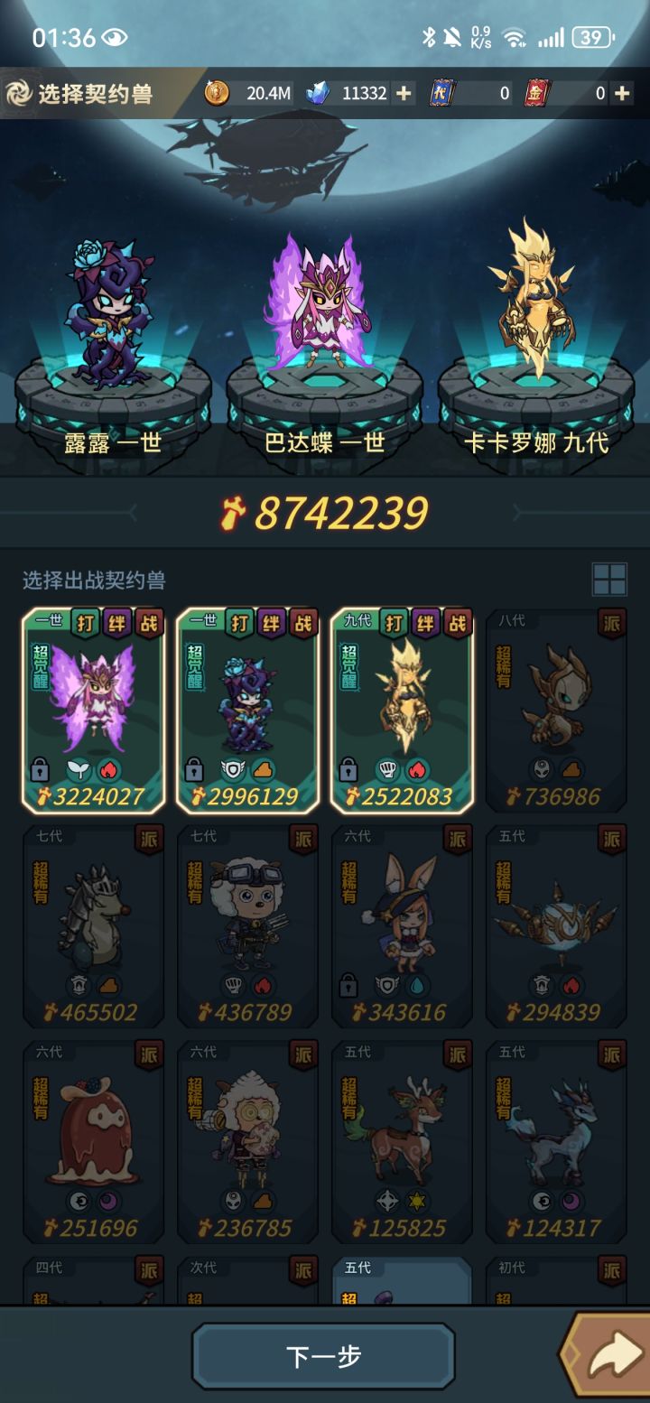 初始宠物:露露或猛犸或格鲁+卡拉鼠+普莱鸭钻石宠老鼠对代数没要求,或着到岛屿西部可以换成一觉蘑菇钻石宠鸭子对代数没要求,魂剑开荒比较缺回复,后面可以考虑带攻速高的蝴蝶(会送到一世)狐狸解锁后,带狐狸+老鼠+鸭子技能:前期有啥带啥,根据等级解锁技能,可以依次选择重斩,裂创,濒死,血光闪重斩清小怪,后面换成血魂如果有无技衣服或着到岛屿西部图,技能可以换成濒死+血魂+裂地+沸腾灯影大厅可