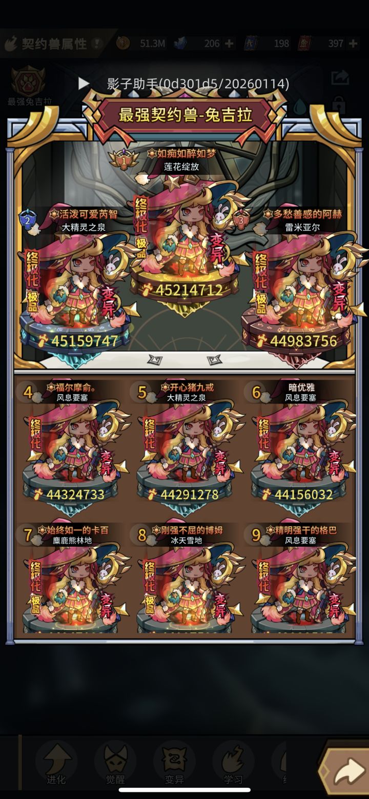 今天给大家分享一下技能变异选择,仅供参考。1.先讲通用技能变异,天赋增伤Ⅲ直接不考虑,只需要在天赋增伤Ⅰ和Ⅱ中抉择,通过计算,在最高天赋项大于1.5倍的最低两项天赋之和时,选择天赋增伤Ⅱ,否则就选天赋增伤Ⅰ。2.专属变异及觉醒变异⑴赤骸龙,核心就是“赤魂”,增加“赤魂”叠加速度和增幅,选择如下图⑵烈焰天马,核心“炎魂”,选减冷却无缝衔接,以及额外增幅,选择如下图⑶兔吉拉,核心机制就是增加