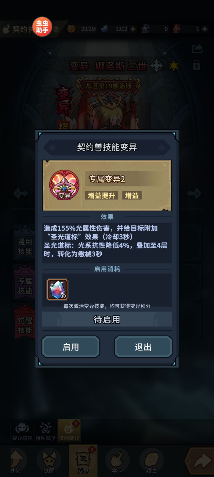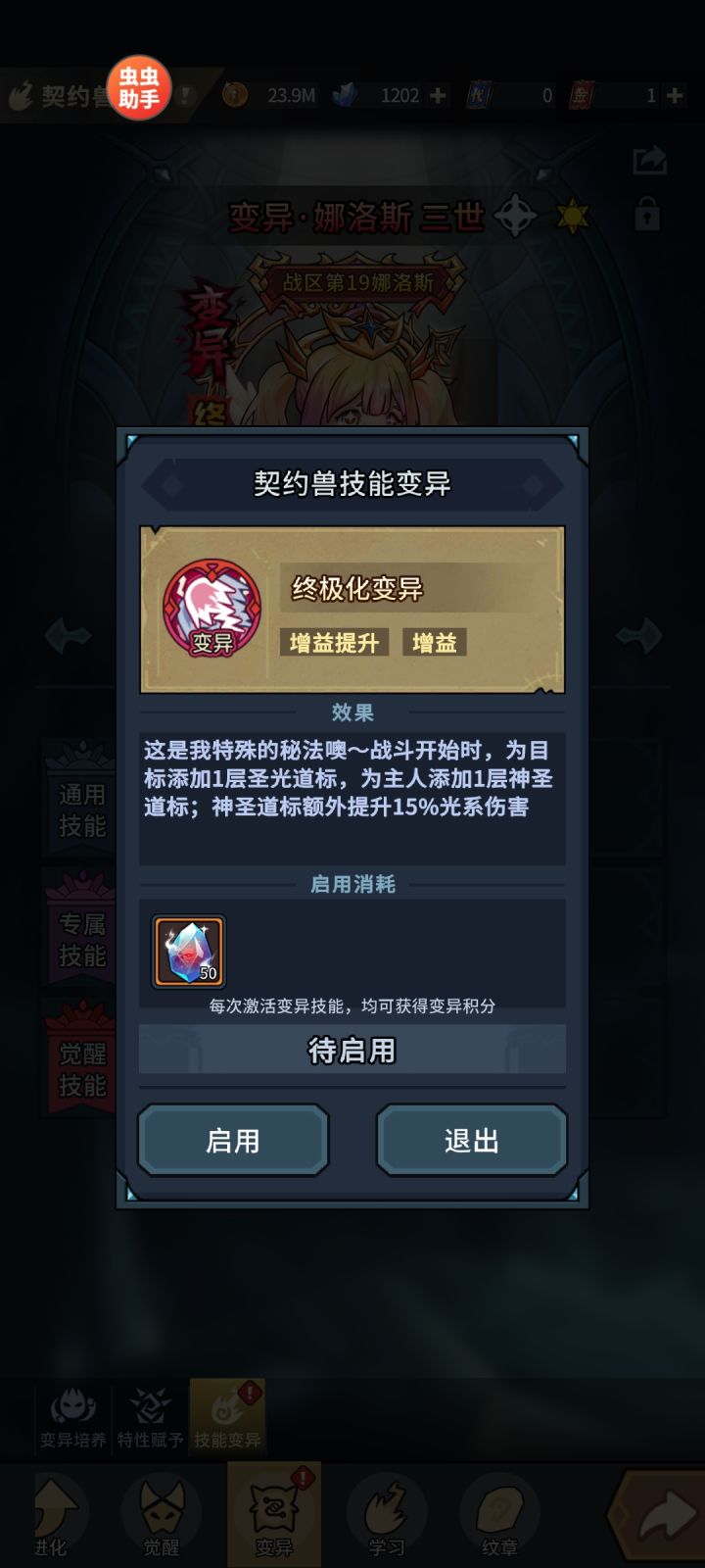变异技能和本来的技能完全一样,还有两个变异数值是负提升,这变异了个撒。哦仔细看还是有点变化,变异完的技能描述少了一个逗号“,”新变异这么期待就不能做好点吗?