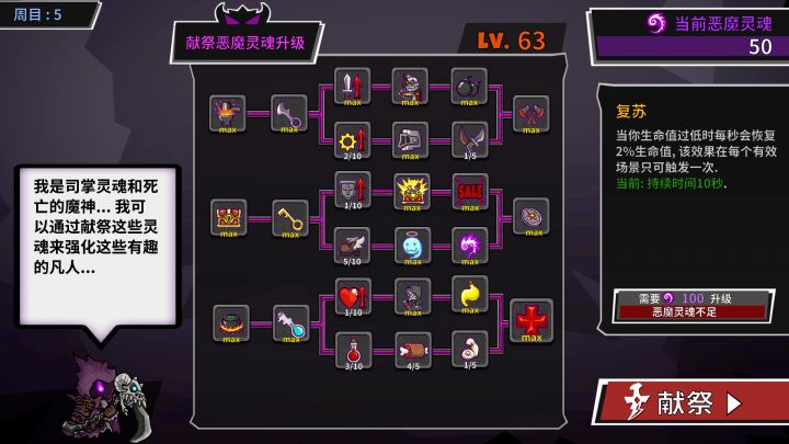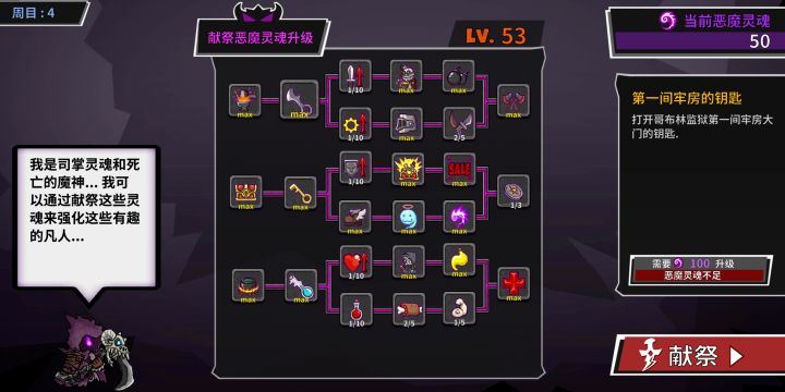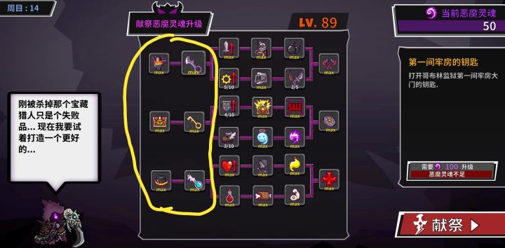 压住刚刚通关三周目的喜悦来写些小tips(就是为了背饰!)1、技能加点先奉上我的加点众所周知,随着等级的增加点技能要耗的灵魂也会增加,刚开始的时候当然是先解锁三个牢房,以及更多的箱子和武器,更多的药水我没有先点,因为在大炼金术士还没点出来的时候谁知道那是药还是毒(欧鳇请无视)。。接下来加点就可能有所不同了,作为一个手残党,开始的时候连第三关boss都见不着面的人,果断先点到灵魂收割者去,也就
