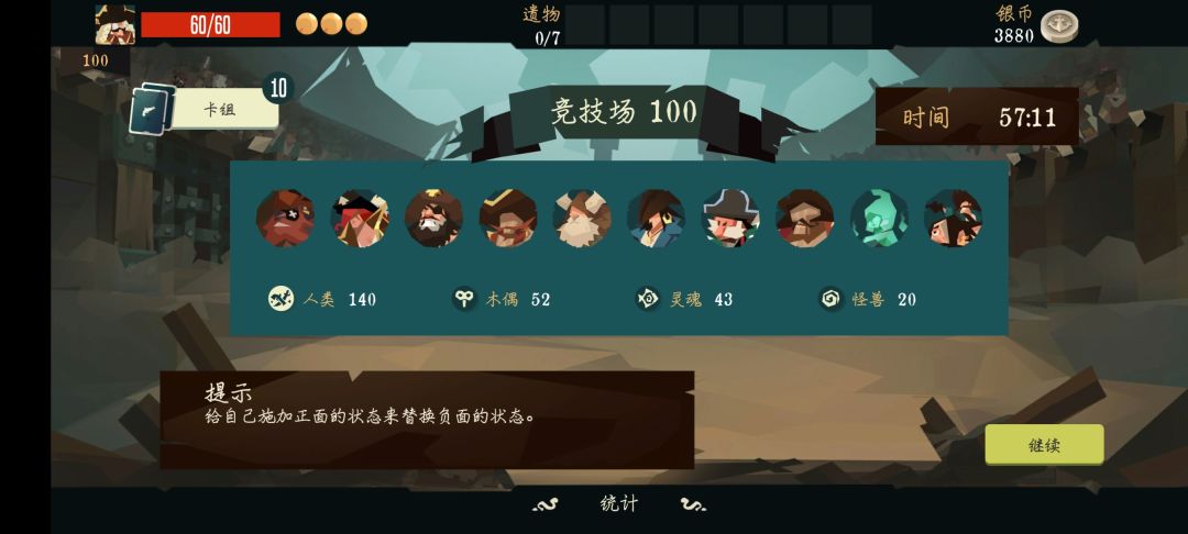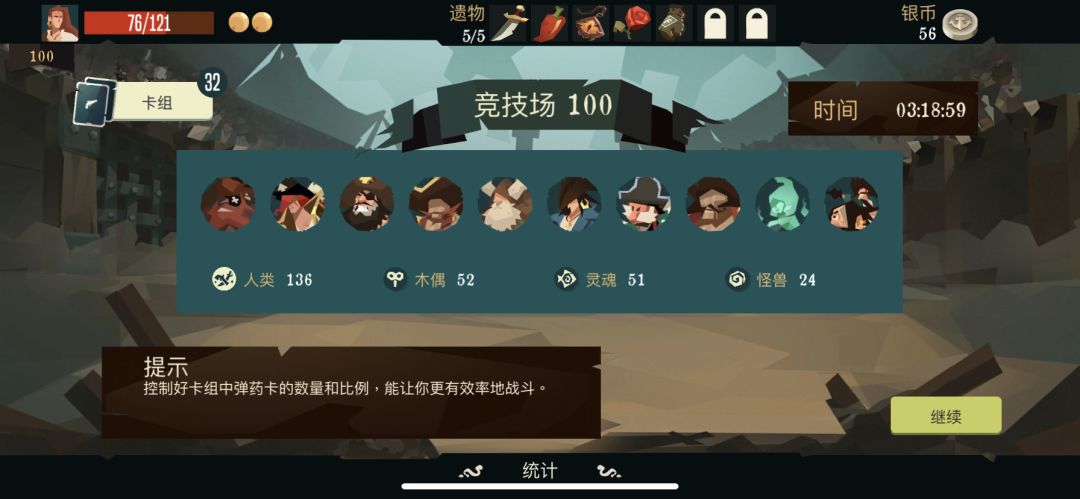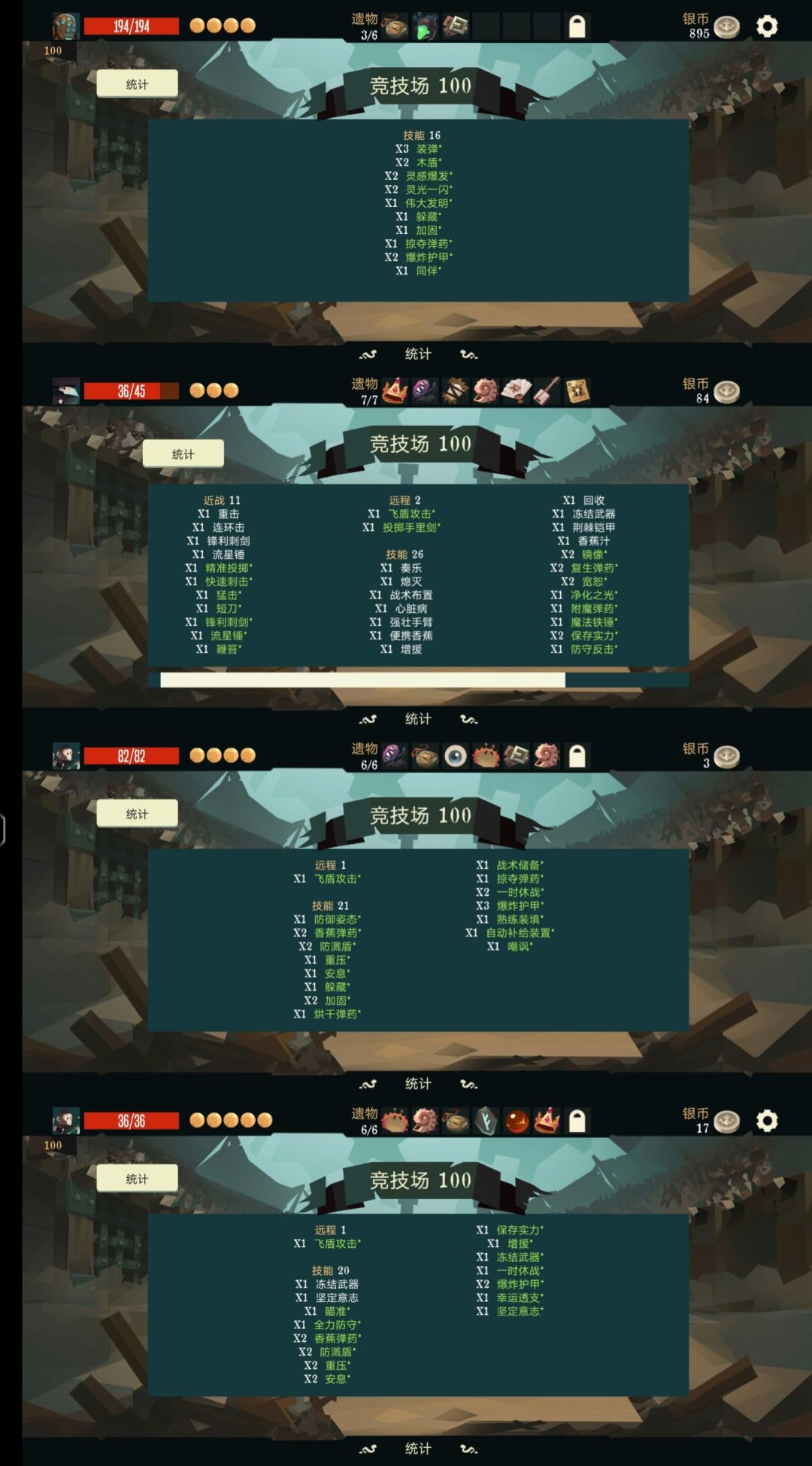 ⑴ 进入竞技场前,查看商店把没用的卡牌和遗物关闭,以免影响战利品。 ⑵ 竞技场要学会经营,竞技场的前十次战斗最好都用来选择战利品,每次刷新不超过四次,遗物栏满了就去卖,脸不黑的情况下,第十关以前就可以有400以上的银币了,之后刷牌就不会出现有牌必拿的情况了。前十关就穷光蛋的赶紧重开吧! ⑶ 根据竞技场的怪物组成自己的卡组,需要注意的怪物以及解决方法 无敌自爆怪 :位移 魔法 重伤 消耗品 有特殊效