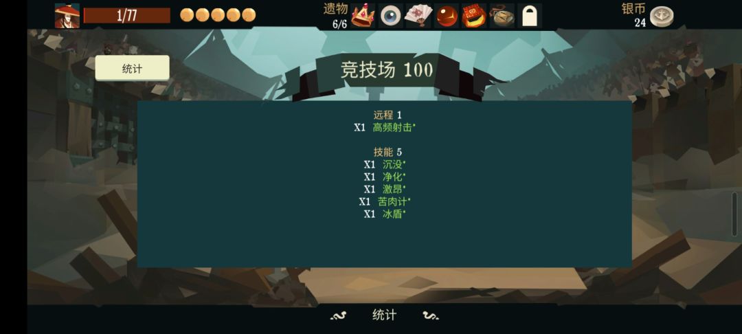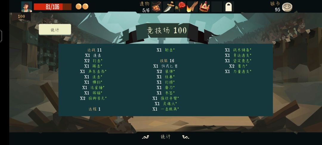 1小时27分,剑客高效通关,基本思路方法如下: 1.几个前提:商店的升级药水类全入,遗物栏扩容1格(6格); 2.竞技场第一关结束找商人刷黄金雕像:刀,前期配合每场结算后的近战卡牌,保障前期的基本战力,也能省费用,如果第一场没刷出来,建议退出重新刷第一关,刷到为止,保证后续高效比; 3.攒钱刷中前期核心遗物“暴击套装”:仪式吊坠+盗贼匕首+玫瑰,前两者保障基本零费暴击输出,玫瑰配合回血,保证基础续