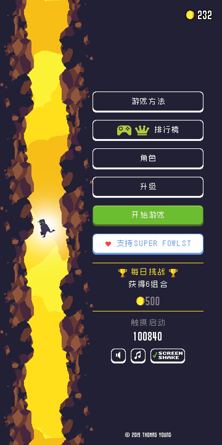 文 | 飞鸡Roguelite!我是一个自由侠!左右点屏幕控制向左或者向右跳一段距离...怪物有各种攻击方式,然后这只鸡炒鸡厉害,需要和怪物接触才能造成伤害...但是同时又需要躲避子弹....就和以往的操作都不大一样:打到第九关会出现BOSS,躲好子弹不贪刀,慢慢可以磨过去,形态也有很多种,随机要素够强....升级项有血量、吸周围道具等,依靠游戏过程中的金币,金币还可以用来解锁角色(对不起