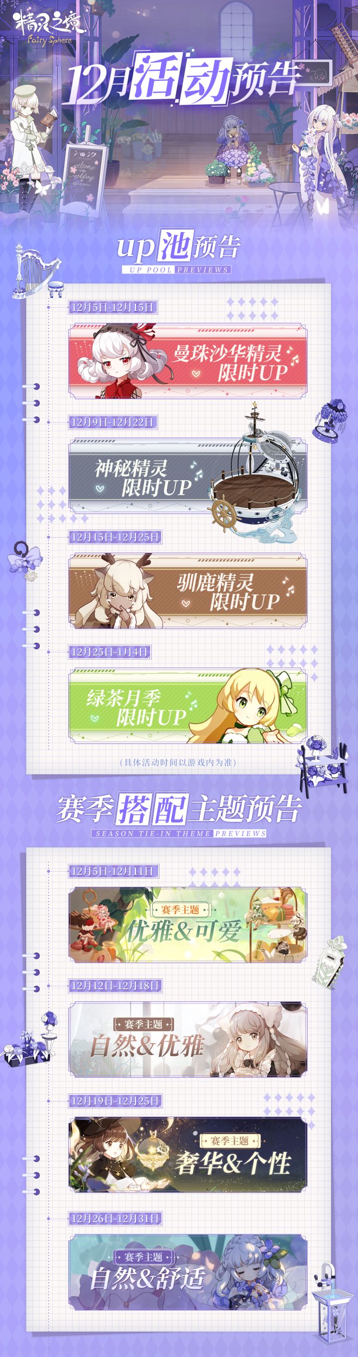里里微森林的小精灵们在魔法师们的陪伴下快乐成长!不知不觉进入了12月,伞伞为大家带来了新一轮的up池预告~高贵优雅的曼珠沙华限时up即将开放,囤票许久只为此刻拥有,还有神秘精灵等待大家发现,看到喜欢的小精灵魔法师们可要准备起来了!具体请看下方长图,魔法师们注意查收👇