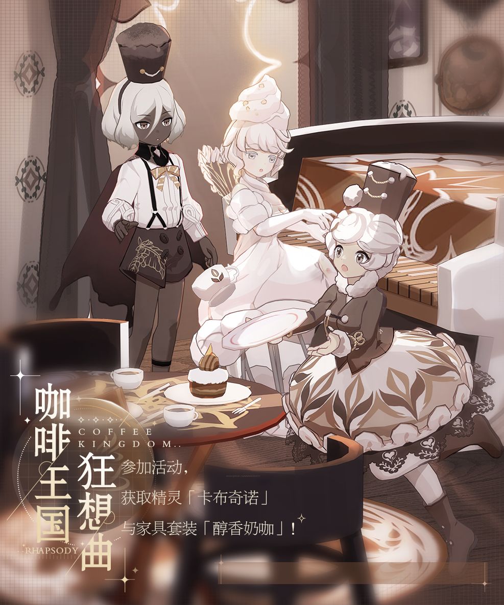「咖啡王国狂想曲」限定活动开启!来自咖啡王国的奇异幻想~与精灵「意式浓缩」&「生奶油」、「卡布奇诺」的再次相遇又将发生什么有趣的故事呢?期待ing~ 一.「咖啡王国狂想曲」活动开启 【活动时间】 2023年02月02日10:00 - 2023年02月16日 10:00 【活动说明】 经营咖啡店,并收集特殊道具「咖啡机零件」,兑换家具套装「醇香奶咖」与其他丰厚道具奖励! 【兑换说明】 活动期间,魔法