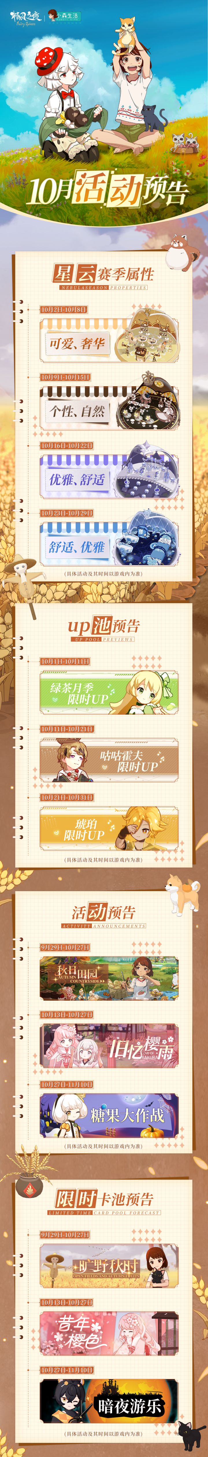 秋光正好,微风不燥,十月踏着舞步悄然而至~属于贴心伞伞的预告时间来咯~❀ 丰收季福利❀10月1日~10月7日 登录游戏,每天可获得(星晶石*300、生涯*8888、金币*8888)丰收季福利礼包一份❀ 丰收季活动预告❀ 10月13日 「旧忆樱语」复刻,再次邂逅漫舞庭院下的少年少女。❀ 10月27日 「糖果大作战」趣味挑战,开启充满童趣和美味的捣蛋王国之旅。❀ 第八章剧情企划制作中~敬请