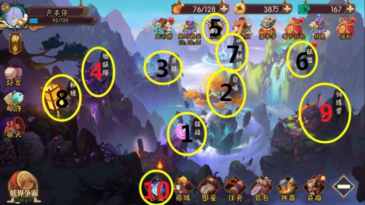 进入游戏走过教程介绍主界面之前玩家们有必要了解的:——游戏所说的第二日,是于第二天0点过后才是第二日,锁妖塔于第二日凌晨5点重置——目前铜钱建议非重氪玩家可以兑换1次或换满20玉那个档次——可自动战斗(6级开放)——扫荡不需要消耗体力值以外的道具——测试阶段无战斗加速(预测正式上架会添加)下面介绍主界面的各主要功能:①【征战】也就是主线,分为普通难度与精英难度,以获取角色进阶材