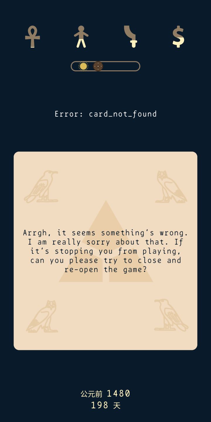前两天通关了,通关之前也卡了小金字塔百度这个游戏除了tap的论坛几乎没啥有用的信息所以留下我的一些心得说起来这游戏里有个有趣的地方,医生看你不舒服问你要不要泡澡,泡了多半泡太久中风死我咋觉得是因为你作为机器人短路了呢游戏目标是通过扮演国王长久统治自己的国家的同时调查神秘金字塔的秘密死亡没有惩罚不过有的卡片只有你活得够久才容易出现死亡时出现的天平是埃及神话中阿努比斯衡量一个人的内心是否纯洁的要素