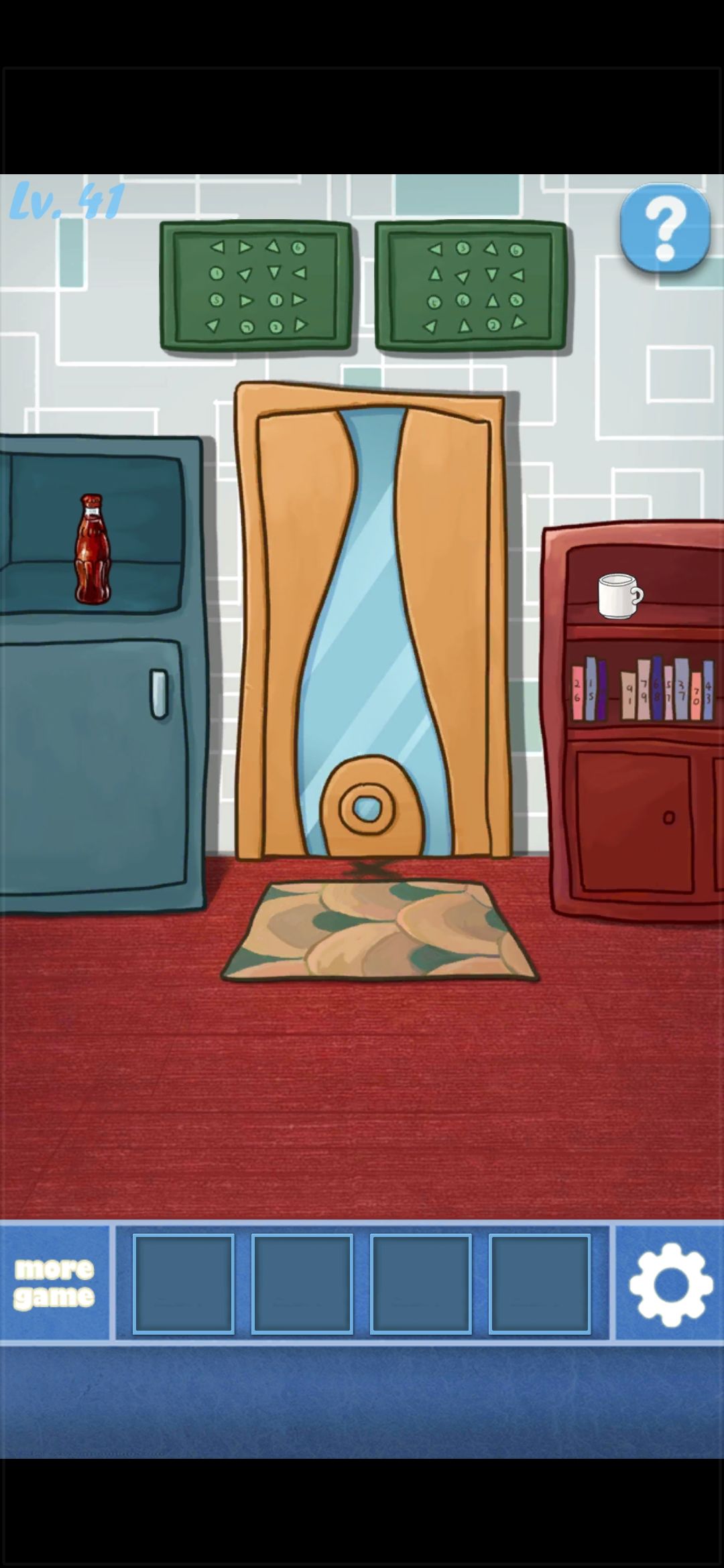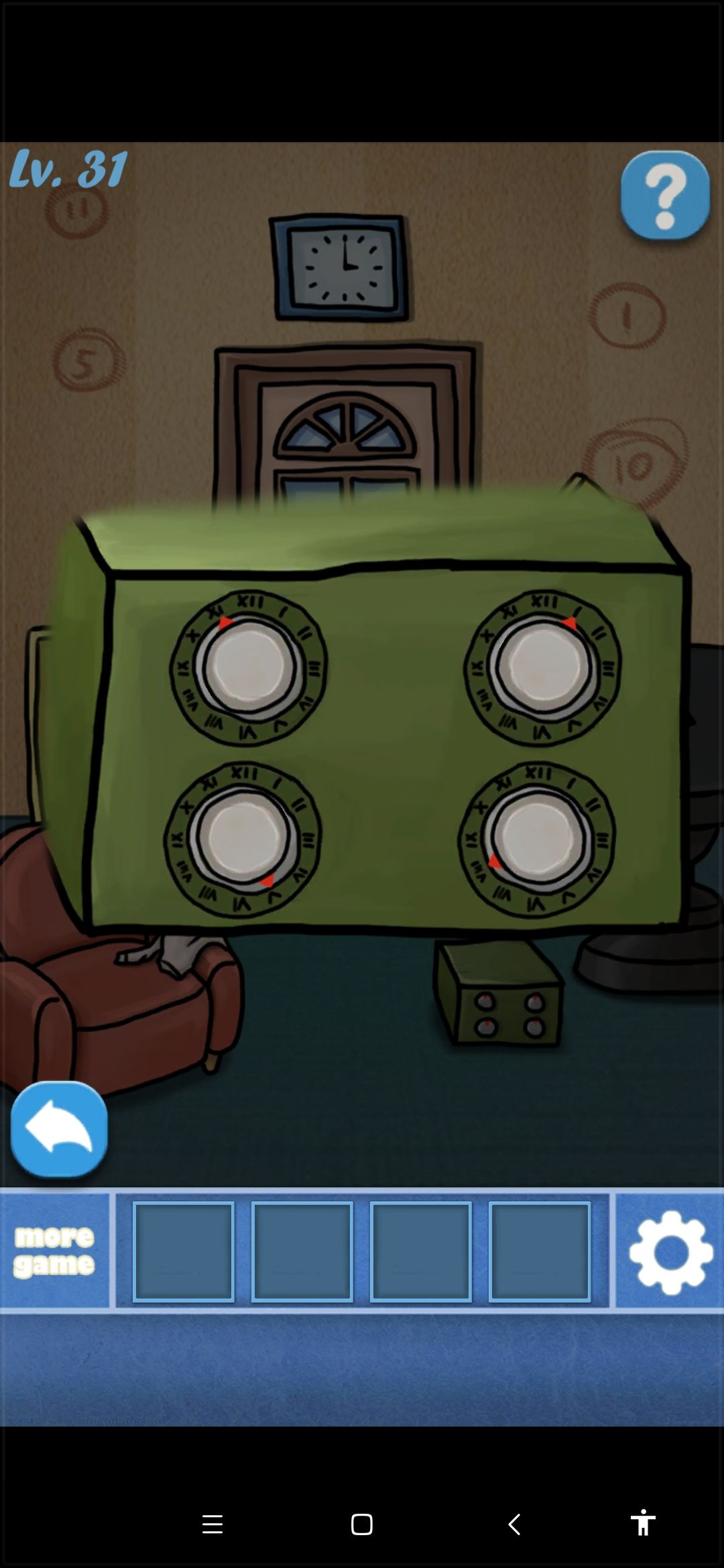 这次不会说的很详细,有问题在评论区问,我会尽量回答。 第31关: 点击右下角保险柜,按照墙上的指示点击转动就行了。获得提示和卡牌1。 顺时针看,每个打叉的地方对应时钟上的数字,依次是2589,将密码输入进左边柜子上。获得小刀和卡牌2。用小刀划开沙发上裂缝,获得卡牌3。点击相框,左边角落还有一张卡牌4。获得四张卡牌后,将卡牌与右边雕塑上的图案一一对应,获得胶带。用胶带采照片上的指纹,开门。 第32关