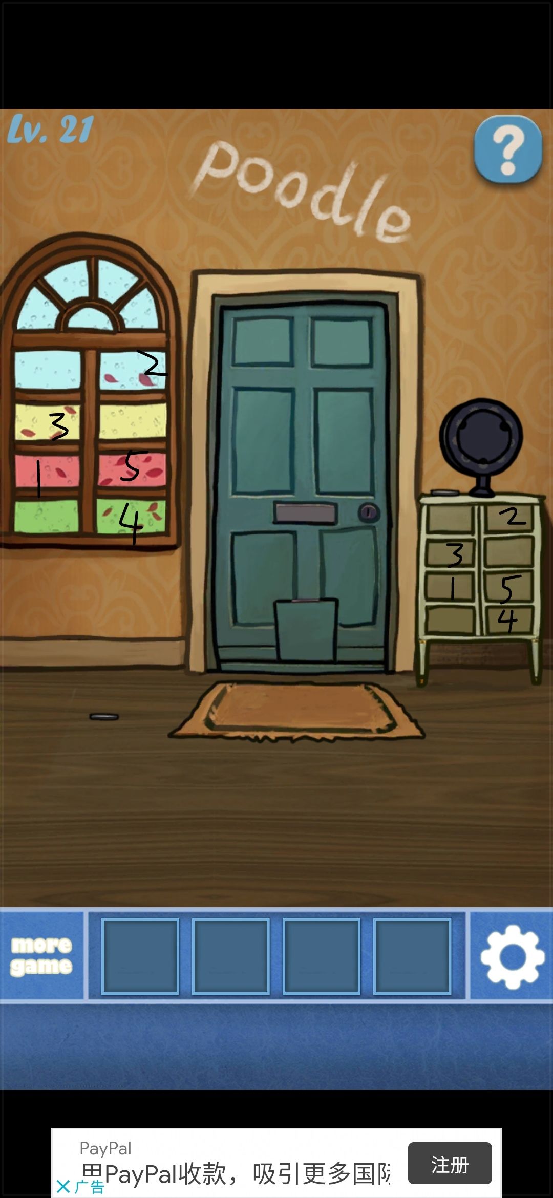 更新了更新了,大家久等了,每次做攻略都要花好多个小时,我是玩完一关做一关攻略的,所以还没玩到后面,后面的攻略我现在还回答不了,等我慢慢玩吧,谢谢大家orz 第二十一关: 观察左边的窗户上叶子的数量,右边的柜子按照从小到大的顺序依次点击即可。 获得一个齿轮拼图和半张纸。点击图示的三个齿轮拼图。把三个齿轮拼图放进柜子上面,随便点几下就可以得到另外半张纸。把这两张纸合在一起。 把中间的黑线当成对称轴,观
